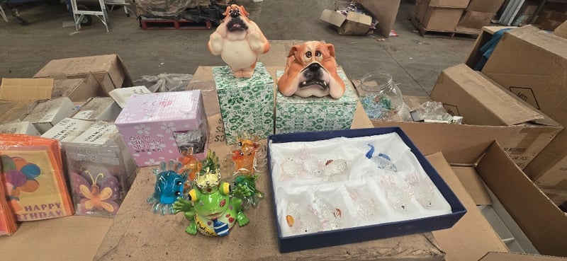 **UNRESERVED** Giftware, Pallet of Assorted items including glass style fish ornaments, dog figures, smelly cards and more Sold as lot