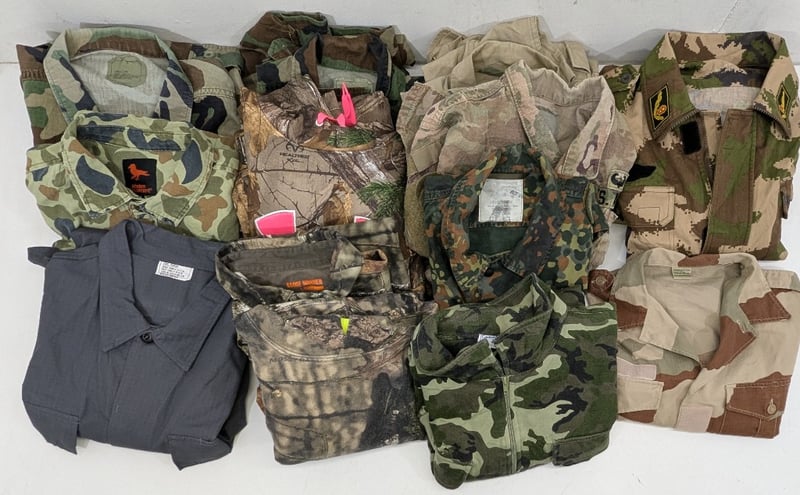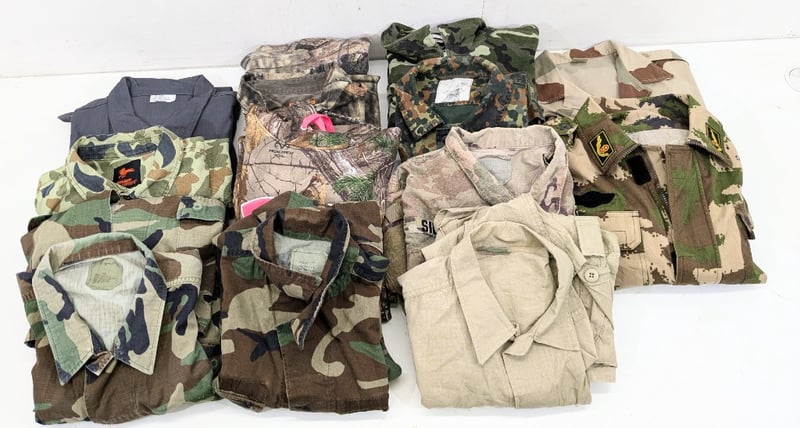 RRP: $600+ , Army Fatigue/ Camo Tops, Jumpers, Shirts. Assorted styles/ colours/ brands, size; Includes M-LQuantity: 13 Sold as lot