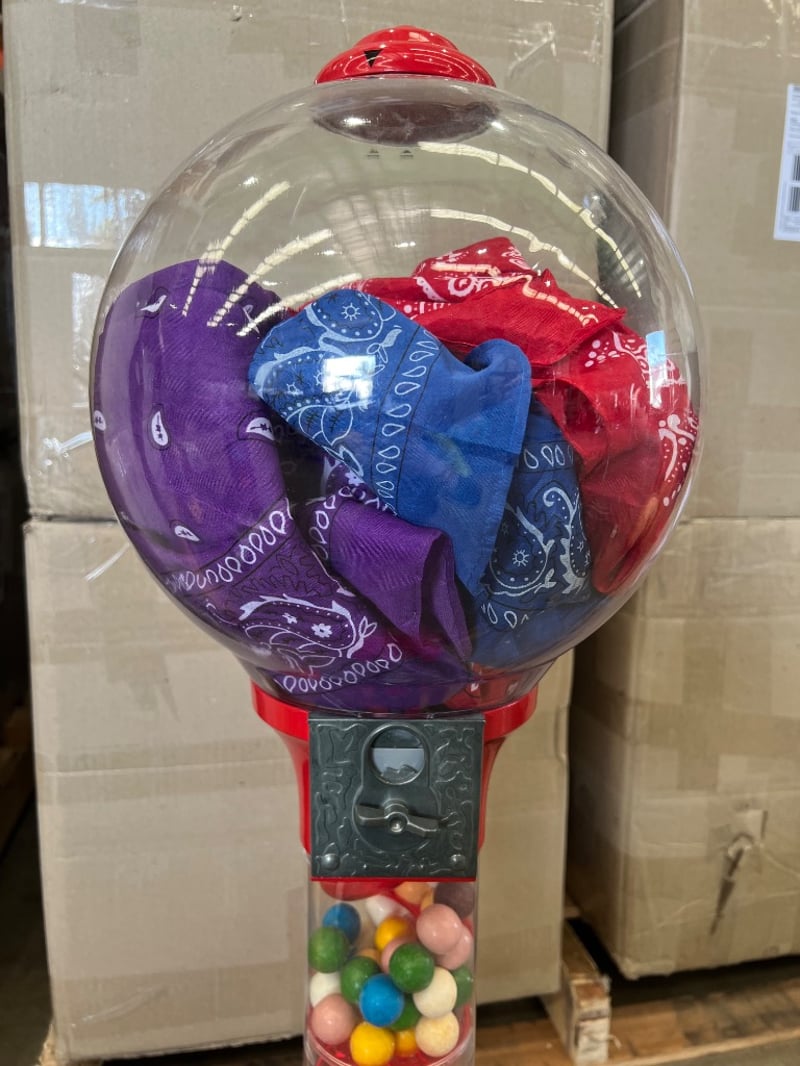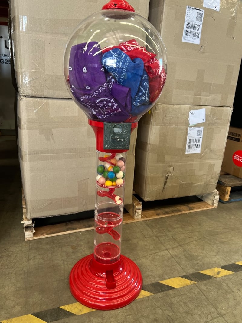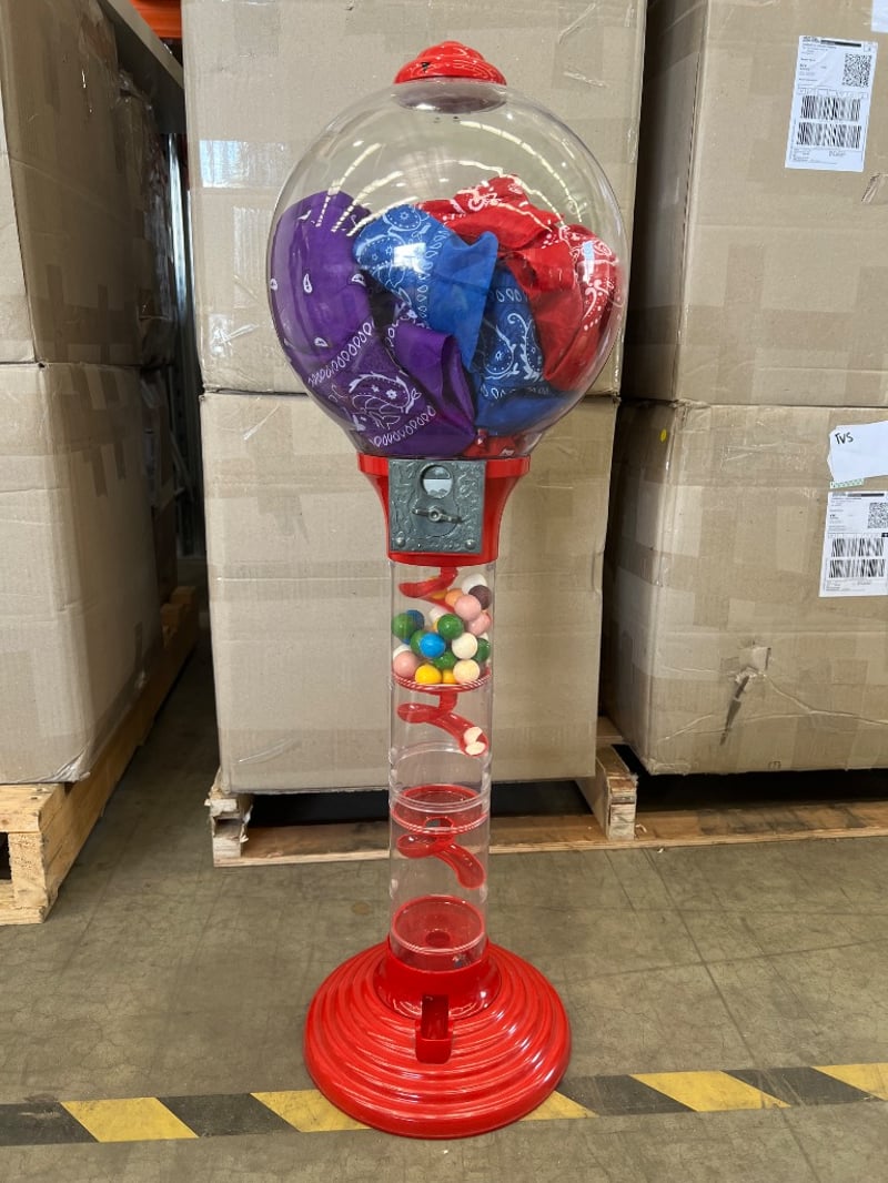 Gum-ball machine, plastic type, red, includes bandanasDimensions approx; 30 x 30 x 94 cm