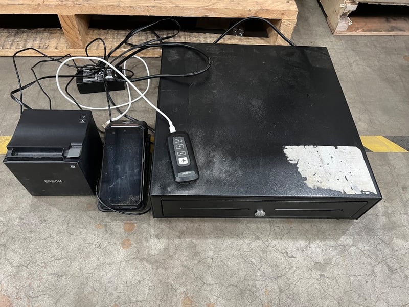 Point of sale (POS) system setup, includes; cash drawer, receipt printer, EFTPOS terminal, barcode scanner, brands include; Epson, ingenico, symbolSold as lot