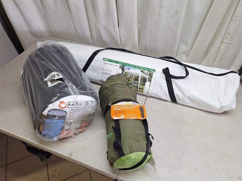 Assorted Camping LotIncludes Gazebo, An Adult & Child Sleeping BagSOLD AS LOT