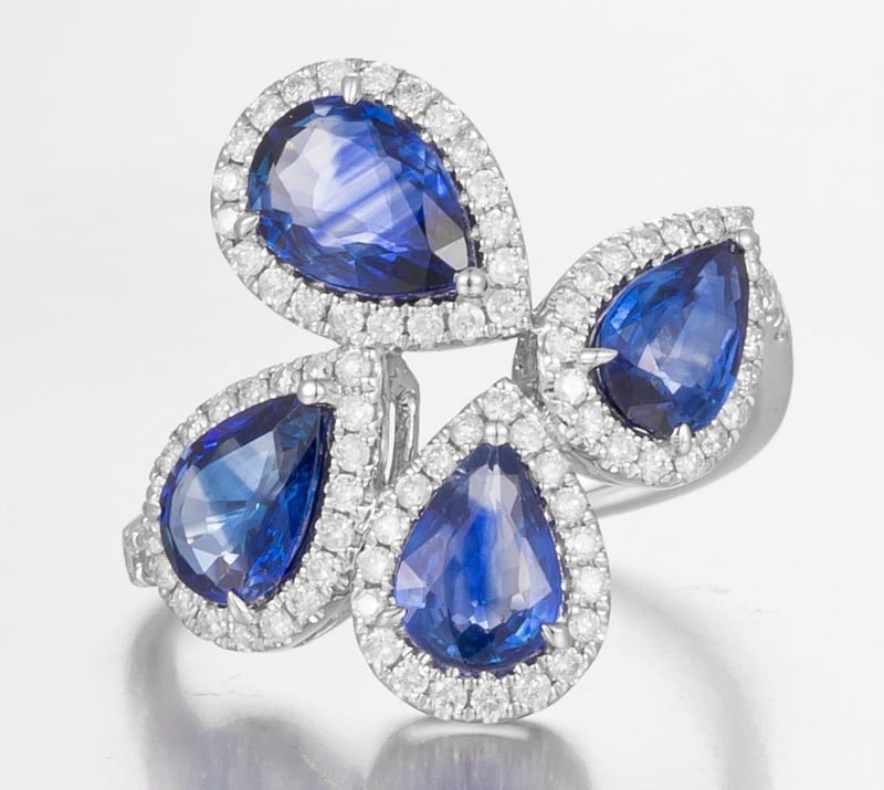14CT WHITE GOLD CEYLON SAPPHIRE AND DIAMOND COCKTAIL RING Features Centre, 4 Pear Cut, Light-Medium Vivid Blue Ceylon Sapphires (3.05Ct Tsw, Heavy Inclusions), Claw Set, With 85 Round Brilliant Cut Diamonds (0.50Ct Tdw, G-H Colour, Si1-Si2 Clarity), Bead Set. Ring Size O. Jewellery Valuations Provided By A Third Party Professional Not Directly Associated With Lloyds Auctions at AUD $21600This Insurance Valuation has been provided by a registered Jewellery Valuer and is intended for insurance purposes only. The valuation amount has no bearing on the auction value of the item. Any questions regarding the valuation should be directed to the issuing Valuer (refer to contact details on the certificate) as Lloyds have no association or relationship with the Valuer or the valuation amount contained within the valuation. 0587812+1721