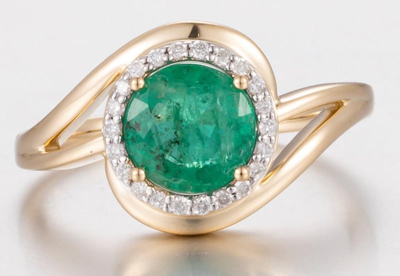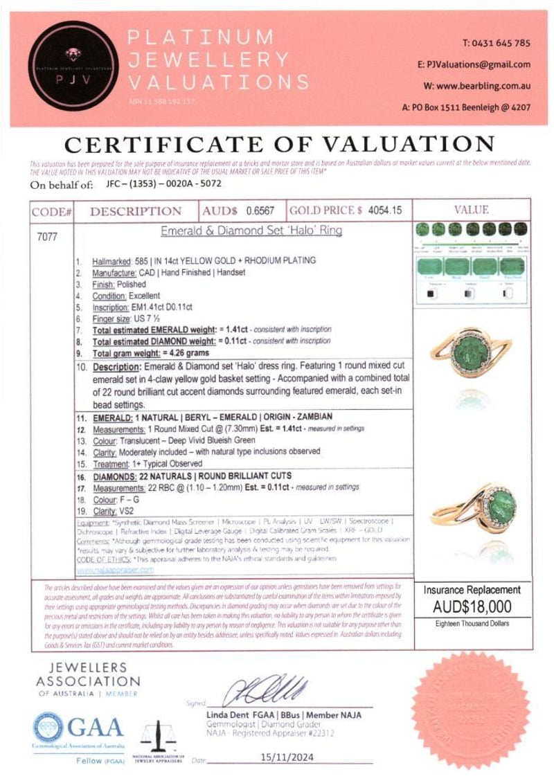 14CT YELLOW GOLD ZAMBIAN EMERALD AND DIAMOND HALO RING