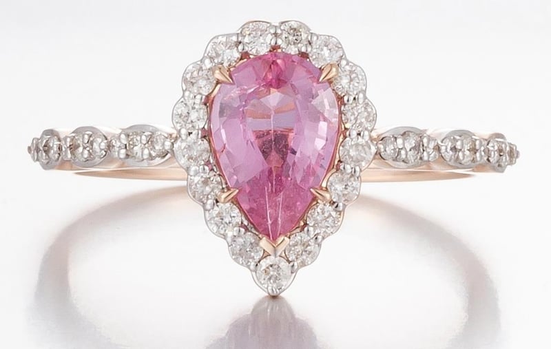 14CT ROSE GOLD PINK CEYLON SAPPHIRE AND DIAMOND HALO RING Features Centre, One Pear Cut, Medium Vivid Orange Pink Ceylon Sapphire (1.09Ct, Moderate Inclusions), Claw Set, With 35 Round Brilliant Cut Diamonds (0.33Ct Tdw, G-H Colour, Si1-Si2 Clarity), Bead Set. Ring Size O. Jewellery Valuations Provided By A Third Party Professional Not Directly Associated With Lloyds Auctions at AUD $18500This Insurance Valuation has been provided by a registered Jewellery Valuer and is intended for insurance purposes only. The valuation amount has no bearing on the auction value of the item. Any questions regarding the valuation should be directed to the issuing Valuer (refer to contact details on the certificate) as Lloyds have no association or relationship with the Valuer or the valuation amount contained within the valuation. 0587812+1746