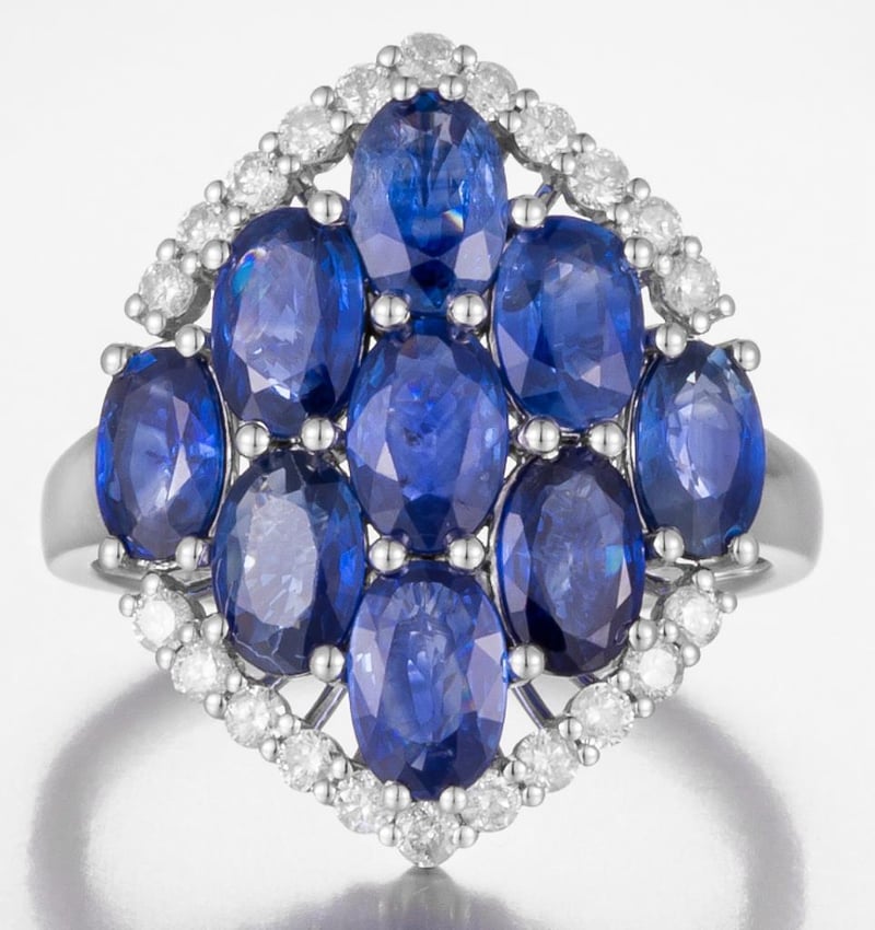 14CT WHITE GOLD CEYLON SAPPHIRE AND DIAMOND CLUSTER RING Features Centre, 9 Oval Cut, Deep Moderate Blue Ceylon Sapphires (4.64Ct Tsw, Moderately Included), Bead Set, With 22 Round Brilliant Cut Diamonds (0.42Ct Tdw, G-H Colour, Vs1-Vs2 Clarity), Bead Set. Ring Size O. Jewellery Valuations Provided By A Third Party Professional Not Directly Associated With Lloyds Auctions at AUD $24000This Insurance Valuation has been provided by a registered Jewellery Valuer and is intended for insurance purposes only. The valuation amount has no bearing on the auction value of the item. Any questions regarding the valuation should be directed to the issuing Valuer (refer to contact details on the certificate) as Lloyds have no association or relationship with the Valuer or the valuation amount contained within the valuation. 0587812+1754