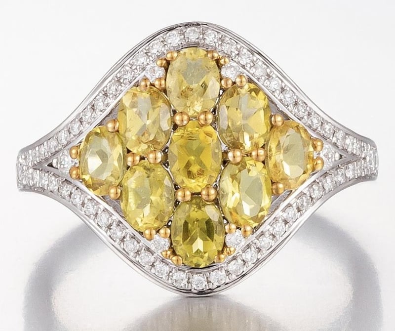 14CT WHITE GOLD TOURMALINE AND DIAMOND CLUSTER RING Features Centre, 9 Oval Cut, Deep Moderate Golden Orange Tourmalines (1.55Ct Tsw, Slightly Included), Bead Set, With 64 Round Brilliant Cut Diamonds (0.29Ct Tdw, G-M Colour, Vs1-Si1 Clarity), Bead Set In White Gold. Ring Size O. Jewellery Valuations Provided By A Third Party Professional Not Directly Associated With Lloyds Auctions at AUD $16000This Insurance Valuation has been provided by a registered Jewellery Valuer and is intended for insurance purposes only. The valuation amount has no bearing on the auction value of the item. Any questions regarding the valuation should be directed to the issuing Valuer (refer to contact details on the certificate) as Lloyds have no association or relationship with the Valuer or the valuation amount contained within the valuation. 0587812+1753