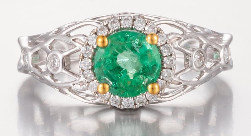 14CT WHITE GOLD EMERLAD AND DIAMOND DRESS RING Features Centre, One Round Cut, Moderate Green Emerald (0.89Ct, Slightly Included), Claw Set In Yellow Gold, With 26 Round Brilliant Cut Diamonds (0.26Ct Tdw, G-H Colour, Vs1-Vs2 Clarity), Pip Claw/Bezel Set. Ring Size O. Jewellery Valuations Provided By A Third Party Professional Not Directly Associated With Lloyds Auctions at AUD $16500This Insurance Valuation has been provided by a registered Jewellery Valuer and is intended for insurance purposes only. The valuation amount has no bearing on the auction value of the item. Any questions regarding the valuation should be directed to the issuing Valuer (refer to contact details on the certificate) as Lloyds have no association or relationship with the Valuer or the valuation amount contained within the valuation. 0587812+1752