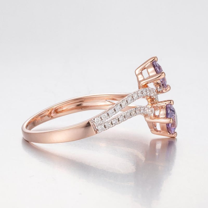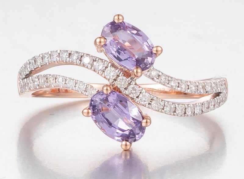 14CT ROSE GOLD PURPLE CEYLON SAPPHIRE AND DIAMOND INFINITY RING Features Centre, 2 Oval Cut, Light Purple Pink Ceylon Sapphires (1.03Ct Tsw, Slightly Included), Claw Set, With 45 Round Brilliant Cut Diamonds (0.20Ct Tdw, G-H Colour, Vs1-Vs2 Clarity), Pip Claw Set. Ring Size O. Jewellery Valuations Provided By A Third Party Professional Not Directly Associated With Lloyds Auctions at AUD $14400This Insurance Valuation has been provided by a registered Jewellery Valuer and is intended for insurance purposes only. The valuation amount has no bearing on the auction value of the item. Any questions regarding the valuation should be directed to the issuing Valuer (refer to contact details on the certificate) as Lloyds have no association or relationship with the Valuer or the valuation amount contained within the valuation. 0587812+1727