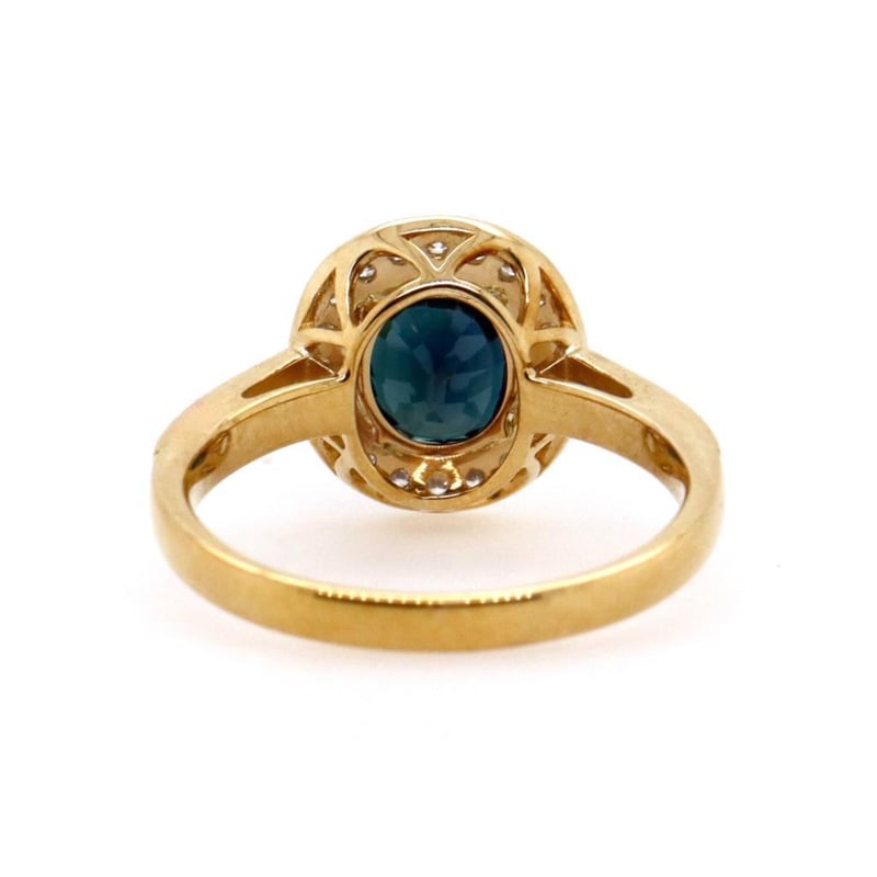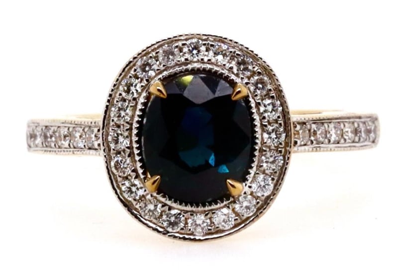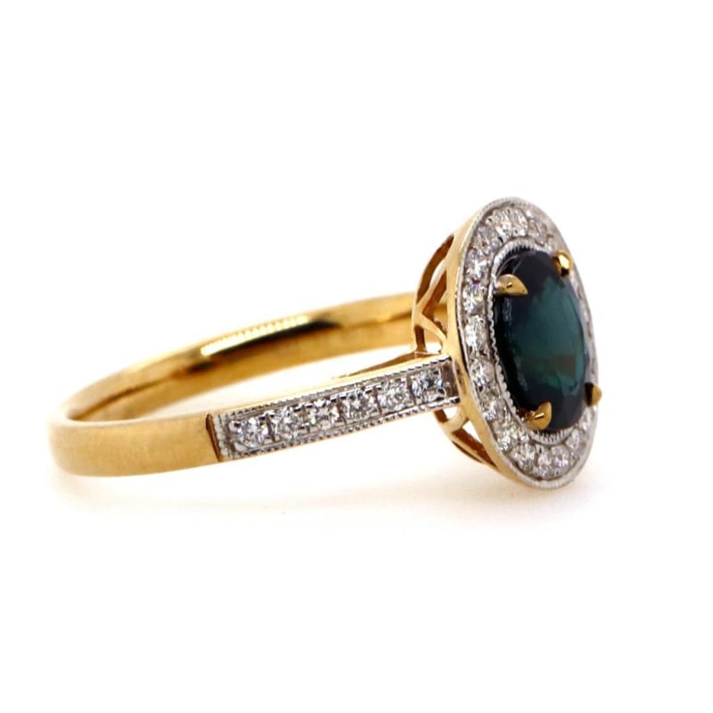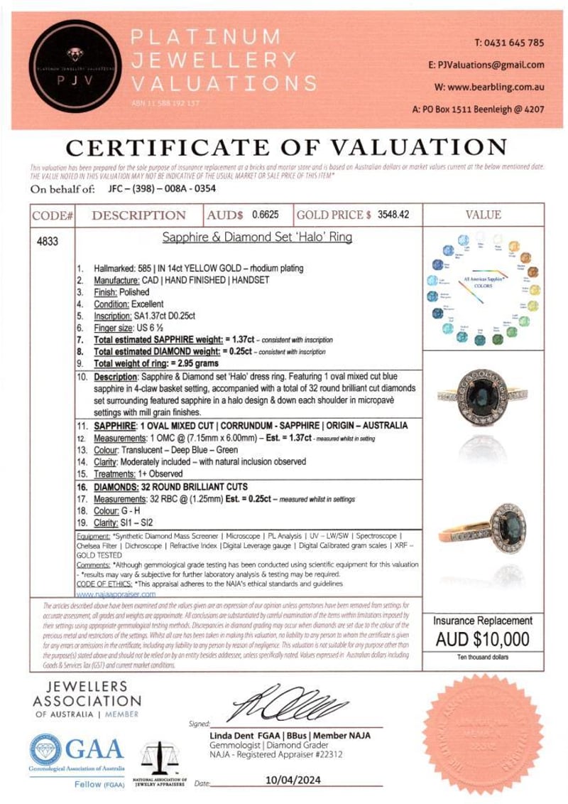 14CT YELLOW GOLD AUSTRALIAN SAPPHIRE AND DIAMOND HALO RING Features Centre, One Oval Cut, Deep Blue-Green Australian Sapphire (1.37Ct, Moderately Included), Claw Set, With 32 Round Brilliant Cut Diamonds (0.25Ct Tdw, G-H Colour, Si1-Si2 Clarity), Bead Set In White Gold. Ring Size M. Jewellery Valuations Provided By A Third Party Professional Not Directly Associated With Lloyds Auctions at AUD $10000This Insurance Valuation has been provided by a registered Jewellery Valuer and is intended for insurance purposes only. The valuation amount has no bearing on the auction value of the item. Any questions regarding the valuation should be directed to the issuing Valuer (refer to contact details on the certificate) as Lloyds have no association or relationship with the Valuer or the valuation amount contained within the valuation. 0587812+1750