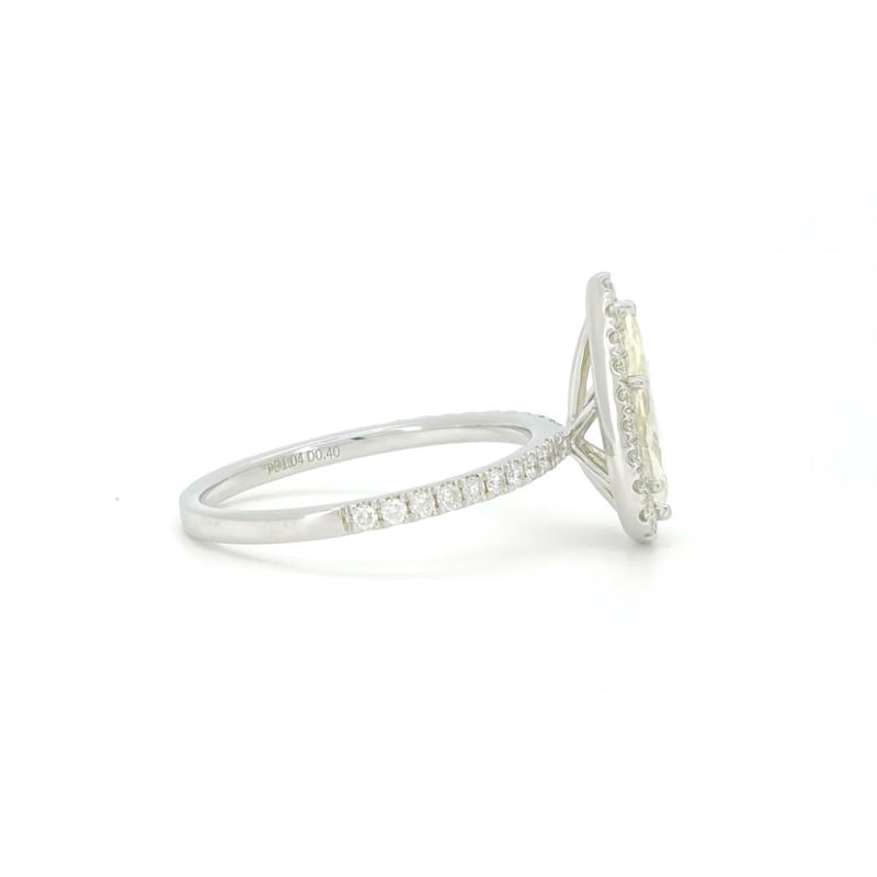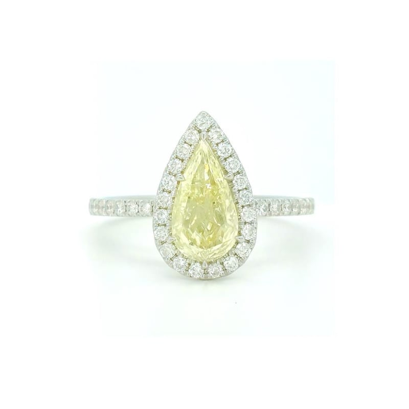 14CT WHITE GOLD DIAMOND HALO RING Features Centre, One Pear Brilliant Cut, Light Fancy Yellow Diamond (1.04Ct, I2 Clarity), Claw Set, With 41 Round Brilliant Cut Diamonds (0.40Ct Tdw, G-H Colour, Vs2-Si1 Clarity), Bead Set. Ring Size O. Jewellery Valuations Provided By A Third Party Professional Not Directly Associated With Lloyds Auctions at AUD $26900This Insurance Valuation has been provided by a registered Jewellery Valuer and is intended for insurance purposes only. The valuation amount has no bearing on the auction value of the item. Any questions regarding the valuation should be directed to the issuing Valuer (refer to contact details on the certificate) as Lloyds have no association or relationship with the Valuer or the valuation amount contained within the valuation. 0587809+626