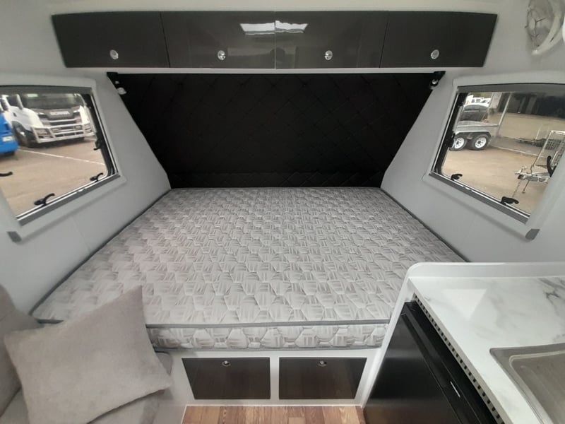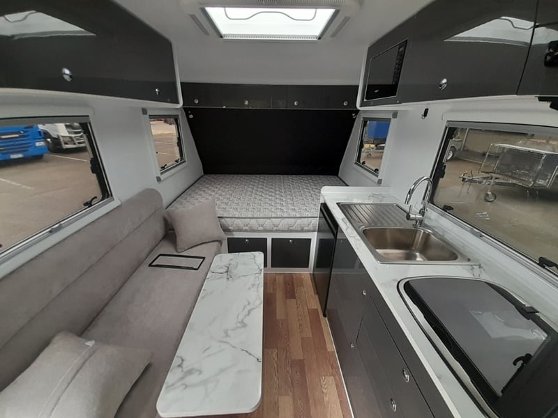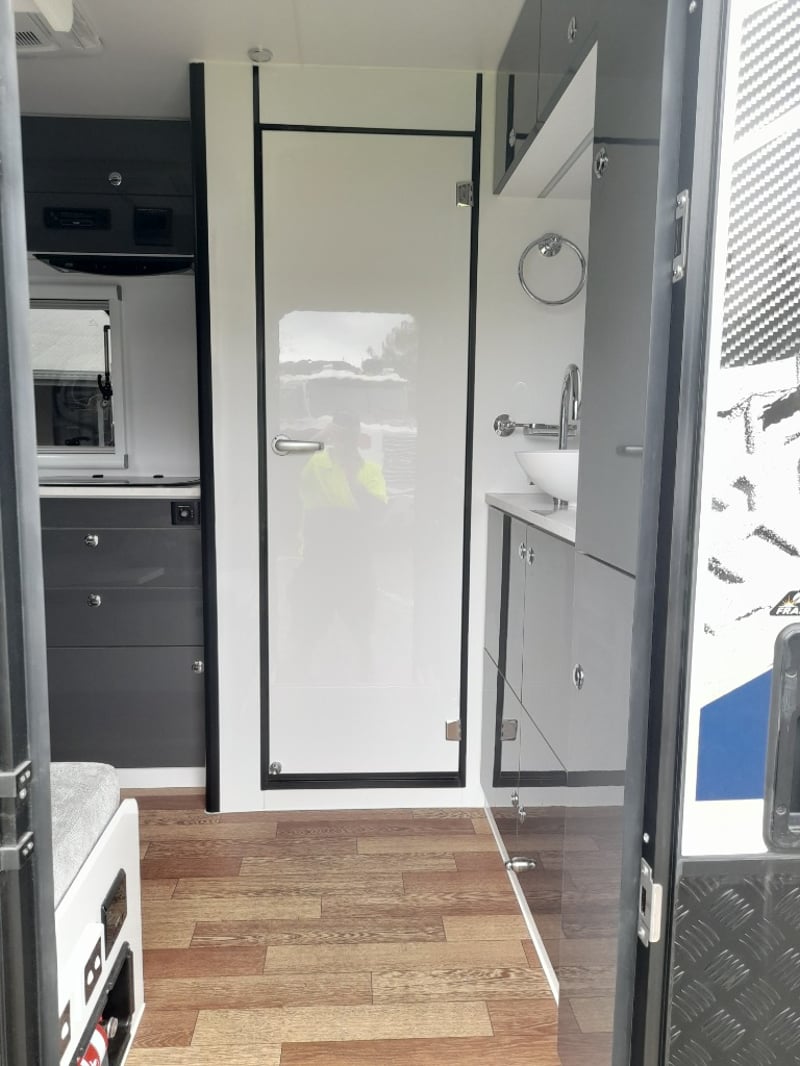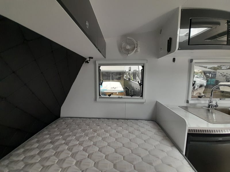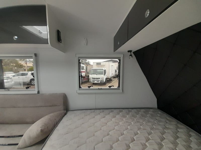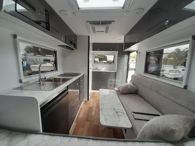 Description: 2 berth, queen size bed and lounge area, internal shower and toilet, 200Ah lithium battery, internal kitchen, 130L fridge, microwave, 350 watts solar power, air con, 1600 watts Pure sine wave Inverter, projecta, electronics, blu tooth stereo, LED lighting,