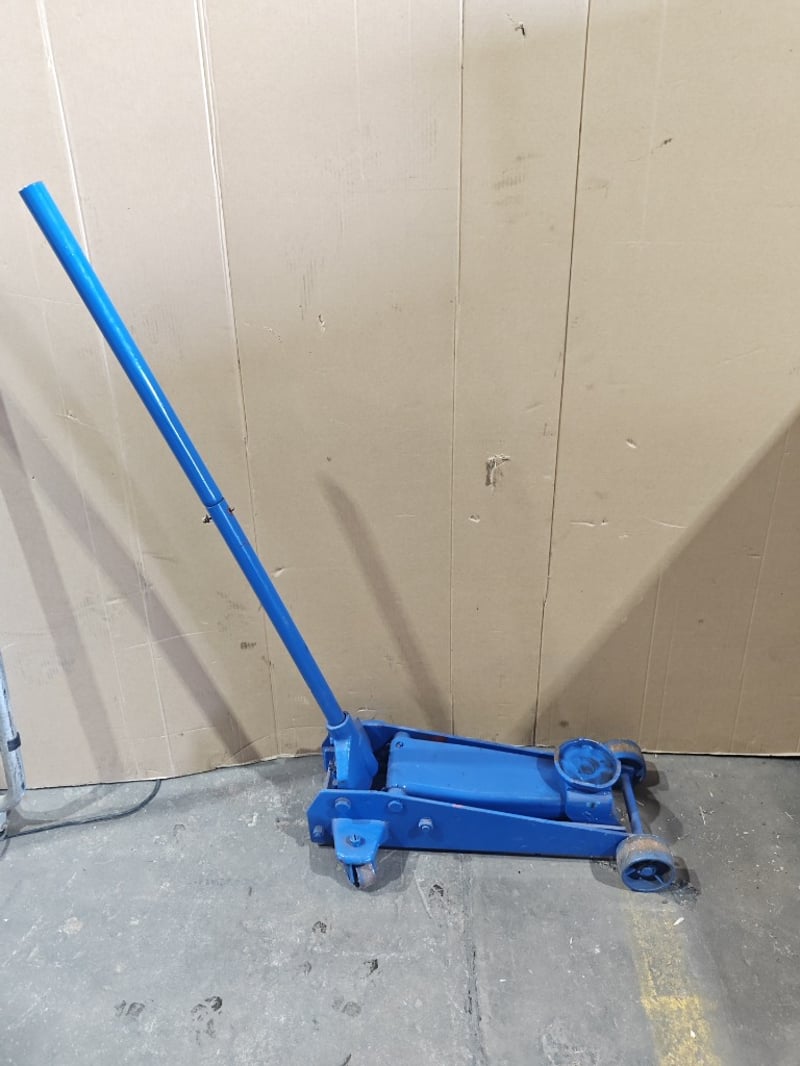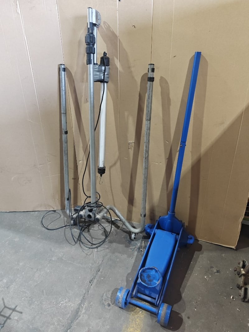 Equipment, 1x Portable Work light Stand & 1x blue hydraulic jack Sold as lot