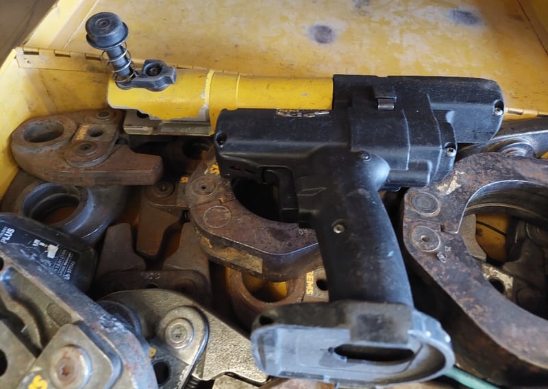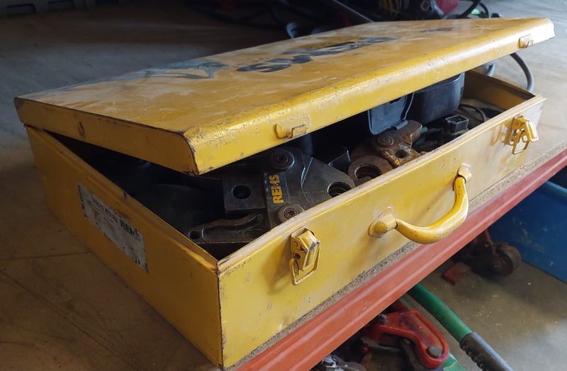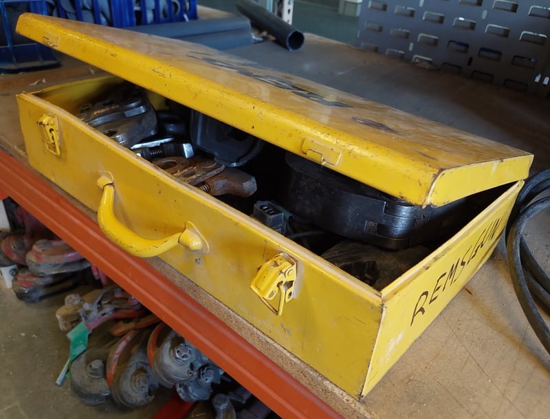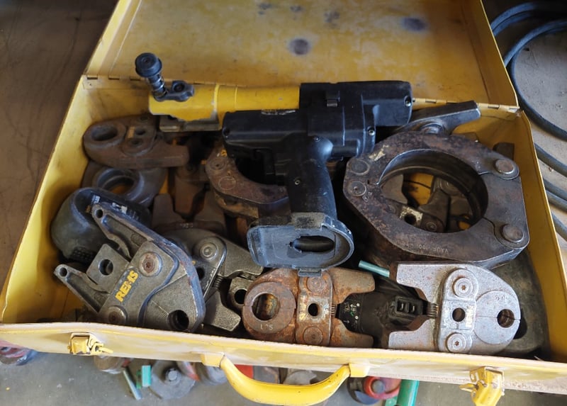 Vintage yellow metal toolbox containing a comprehensive collection of engineering and mechanical components. The toolbox features a hinged lid with brass latches, carrying handle, and appears to be industrial-grade storage. Contents include a pneumatic impact wrench with yellow and black casing, multiple brake calipers. Sold as lot Note: Items may be new, used, or untested, and their condition or functionality is not guaranteed.