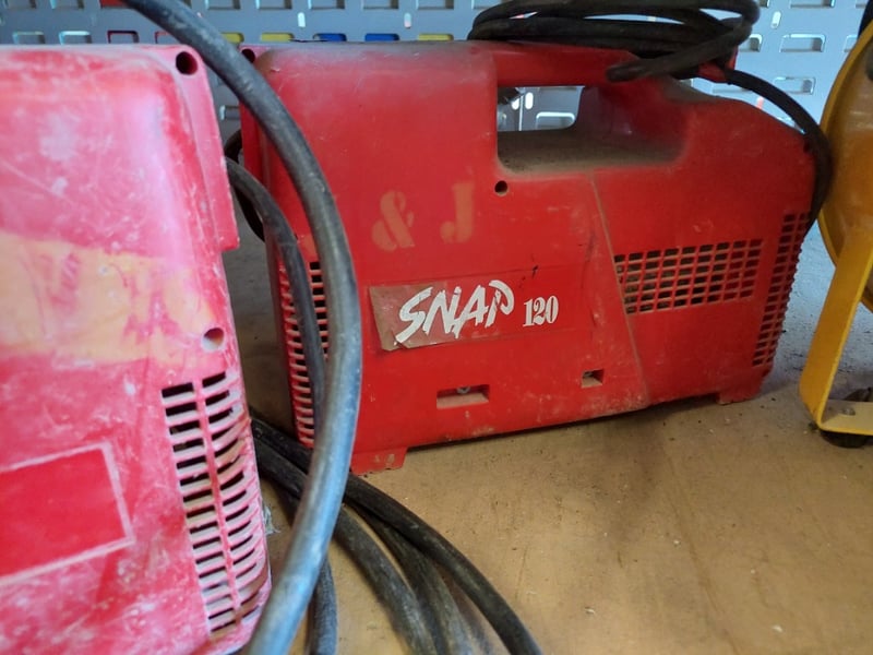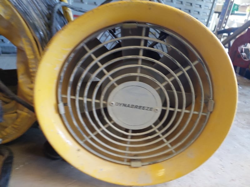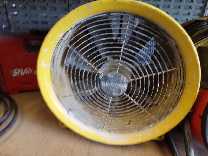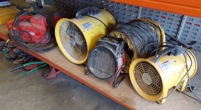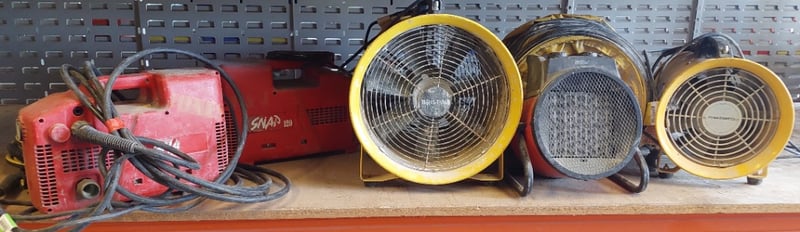 Professional-grade industrial ventilation and heating equipment. Features one SNAP 120 portable electric heater (red, robust construction with visible wear), multiple yellow drum fans with varying specifications including mesh and open-face designs, portable blowers with extended hoses, and additional red industrial heaters.