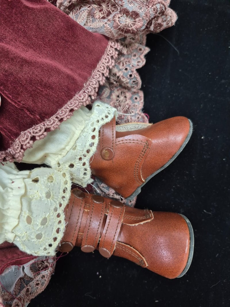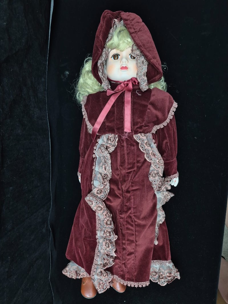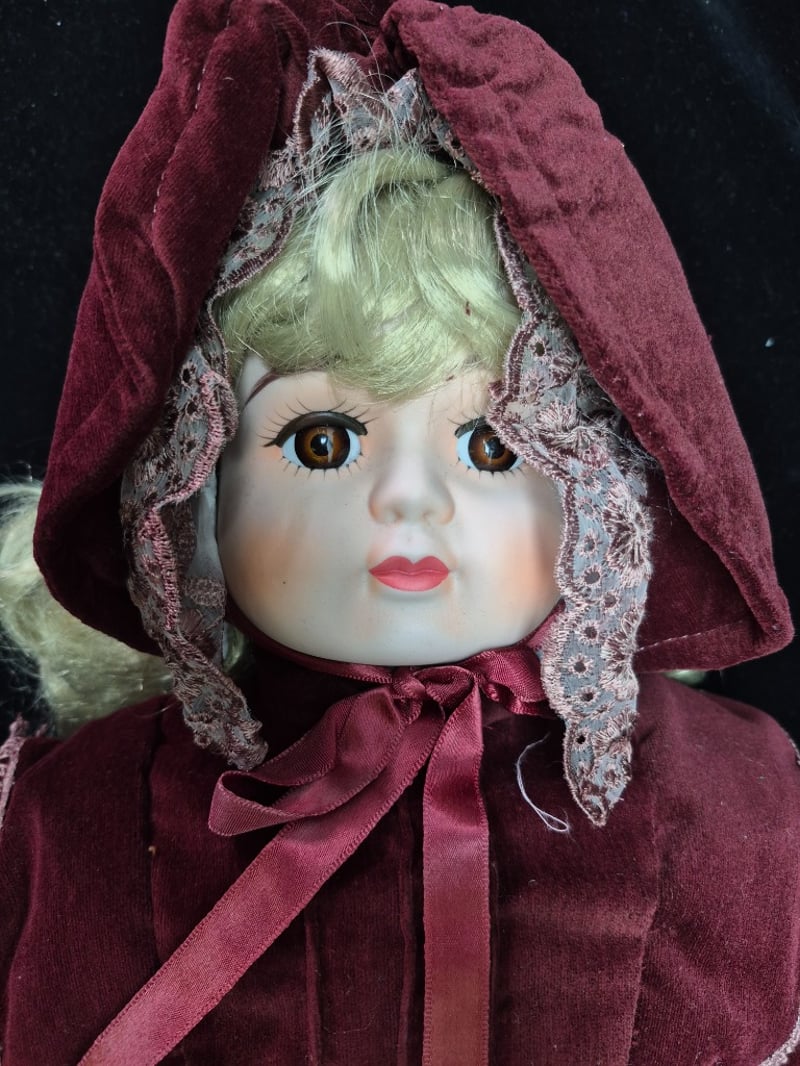 PORCELAIN DOLL IN BURGUNDY VELVET DRESSCondition: Good - Refer To Images5C587808+2