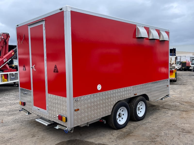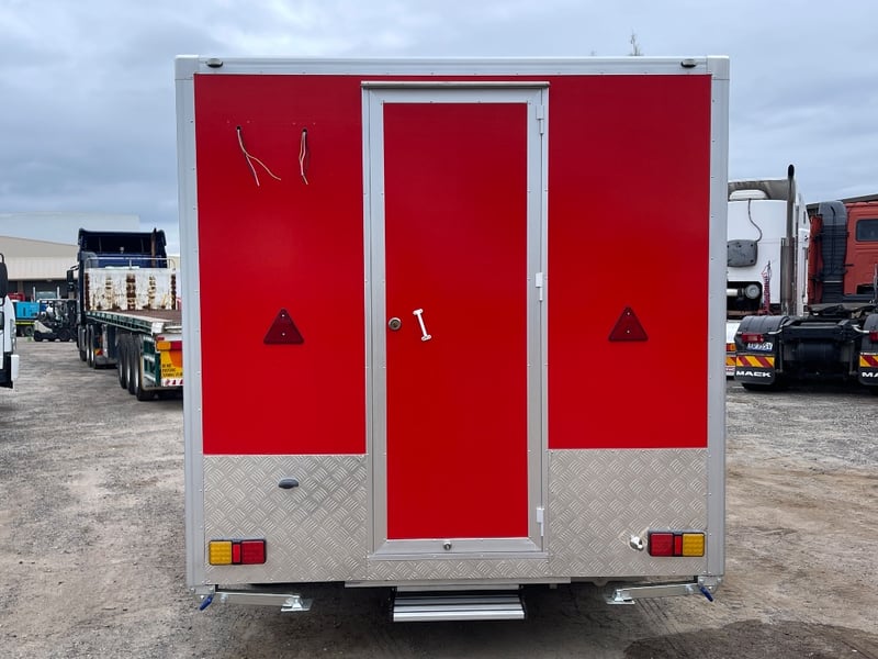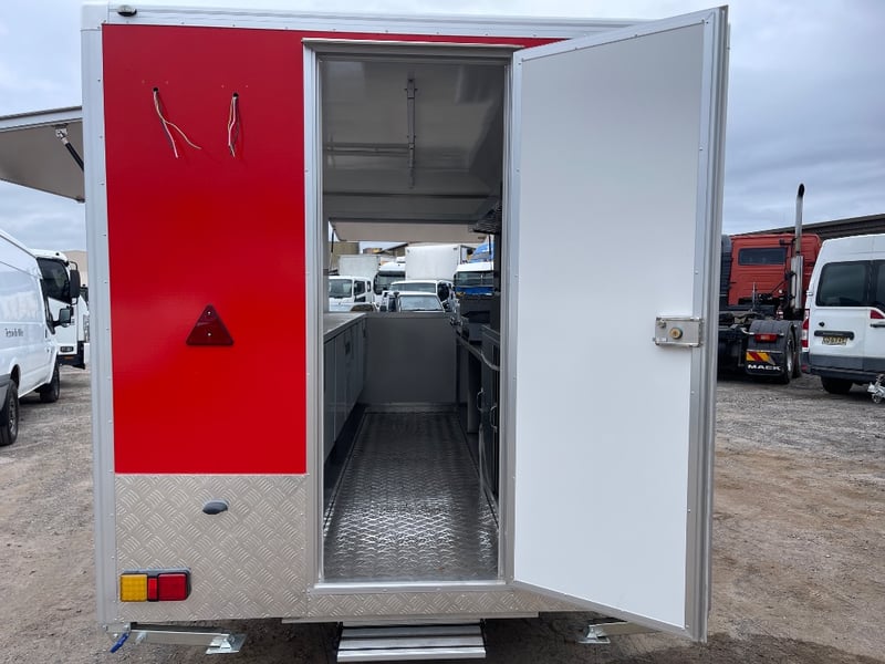 Tare weight : 1200kg with equipment, ATM :2000kg, Chequer plate protection on the front and sides, 4 x heavy duty stabilizer legs, Chassis and frame: galvanised steel, Brakes override mechanical brakes system, Body fibreglass panels with thermal insulation, Three lift up service windows , Rear door with lock