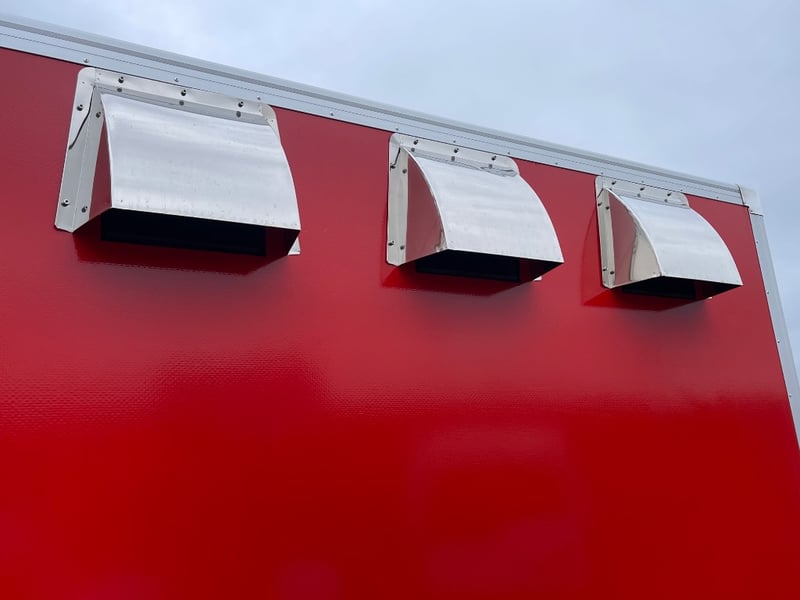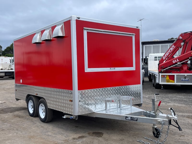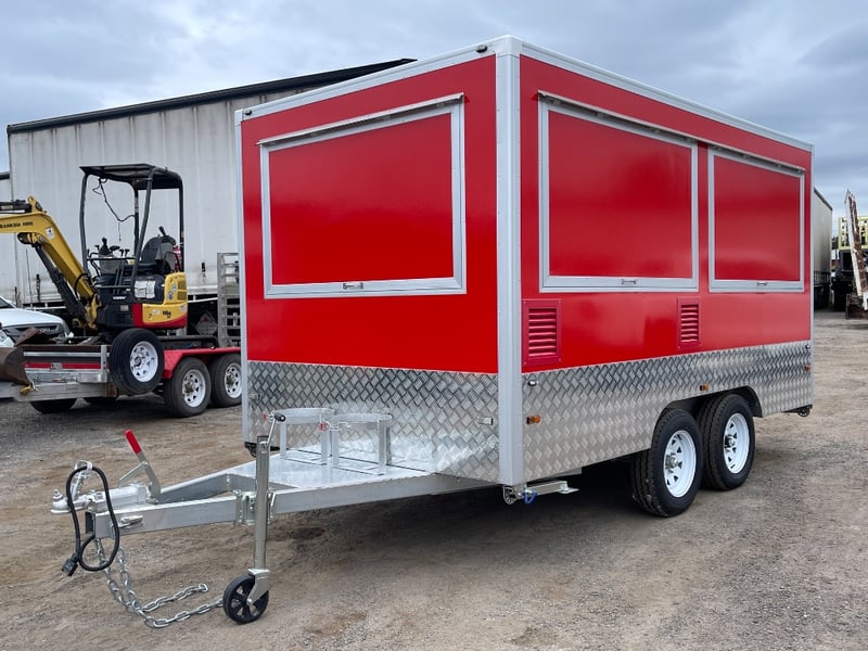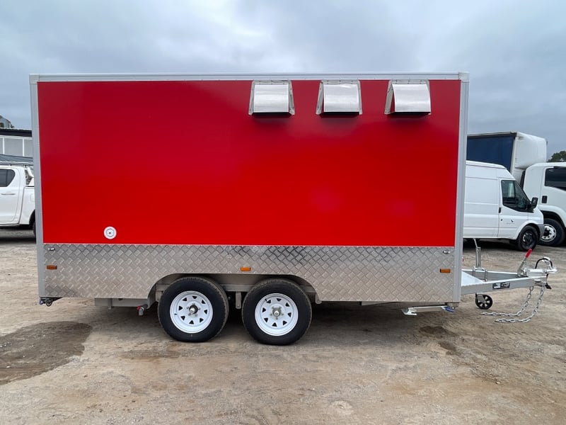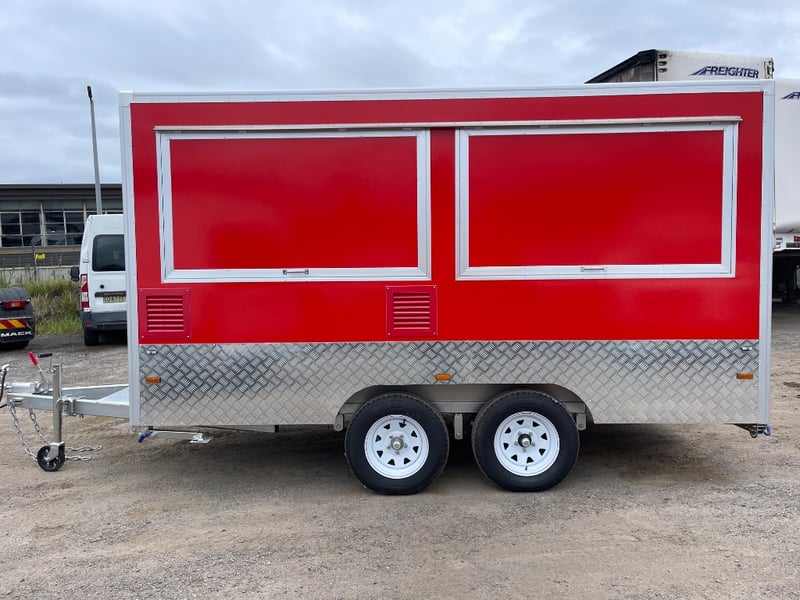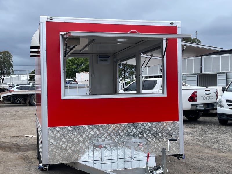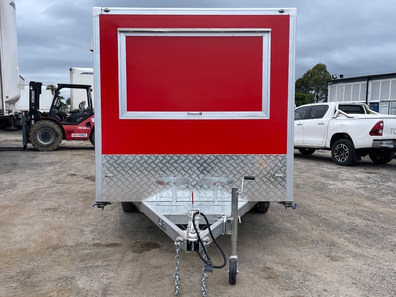 5450mm, Wide: 2150mm, Height from ground: 2550, Window Openings: 2x940hx1600L , 1x940hx1540L lift up service windows, Draw bar length: 1700mm, Draw bar size 100x50x4mm, Tow hitch 2000kg