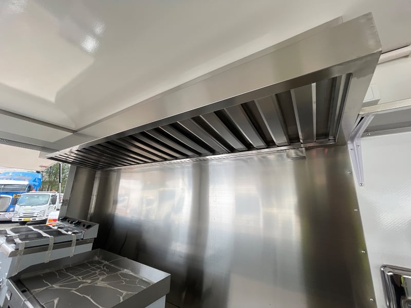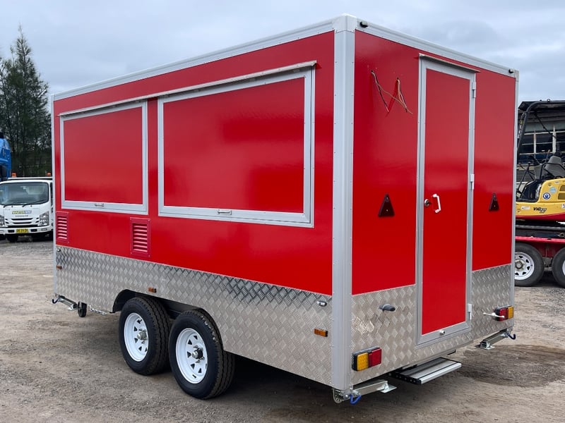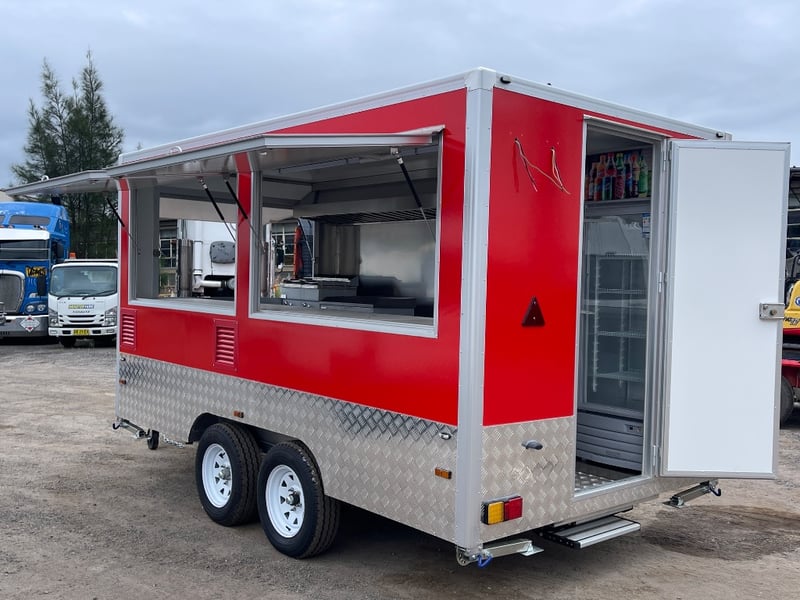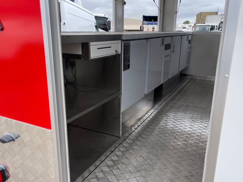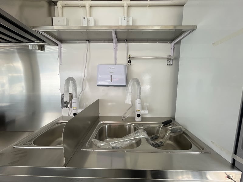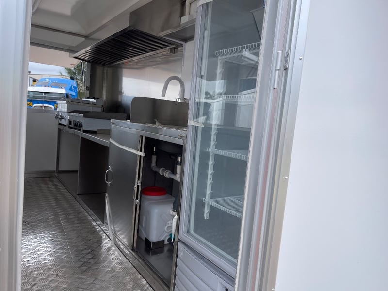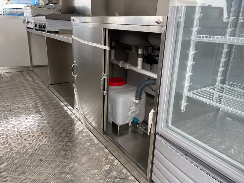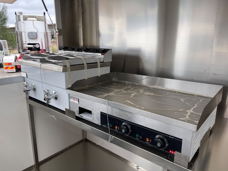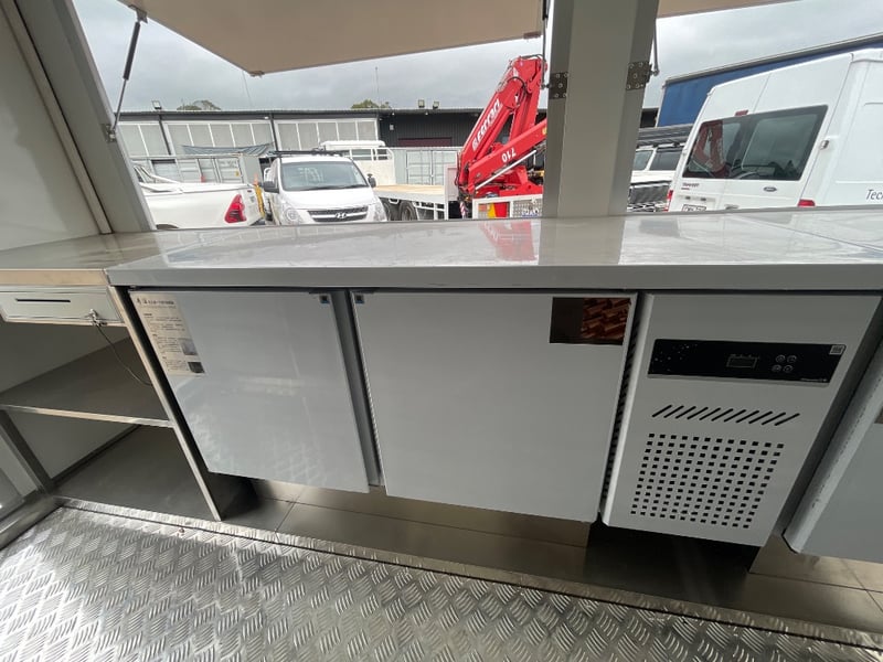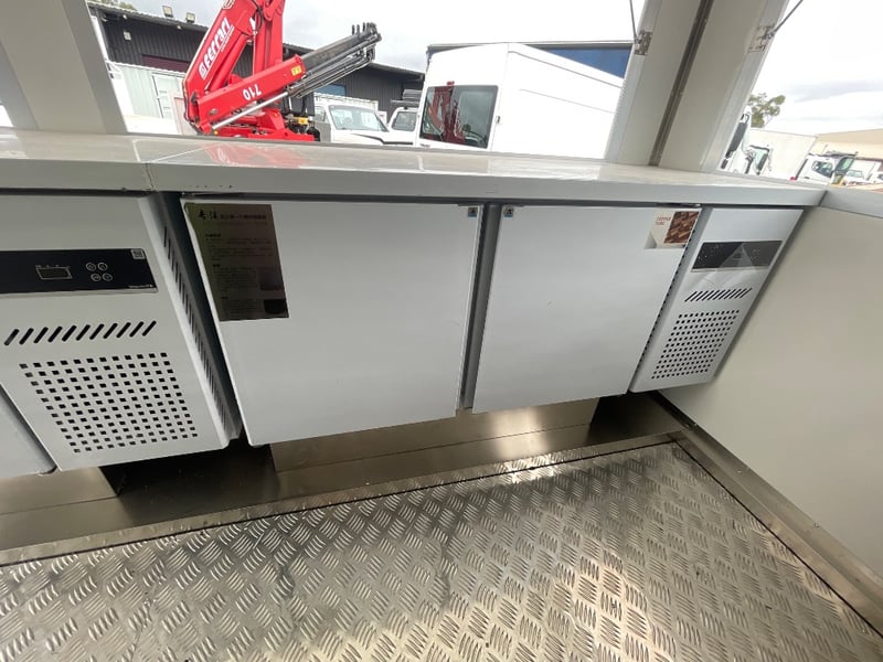 Flooring aluminium chequer plate non slip with drain for easy cleaning, Water system : 2x30L water tanks , 20L waste tank, Double bowl sink with hot and cold water and additional sink hand wash or rinsing sink with hot and cold water, Stainless steel bench tops, Freezer under bench type 2 door with stainless steel top, Fridge under bench type 2 door with stainless steel top, Double Fryer 12L Electric, Hot plate 730mm