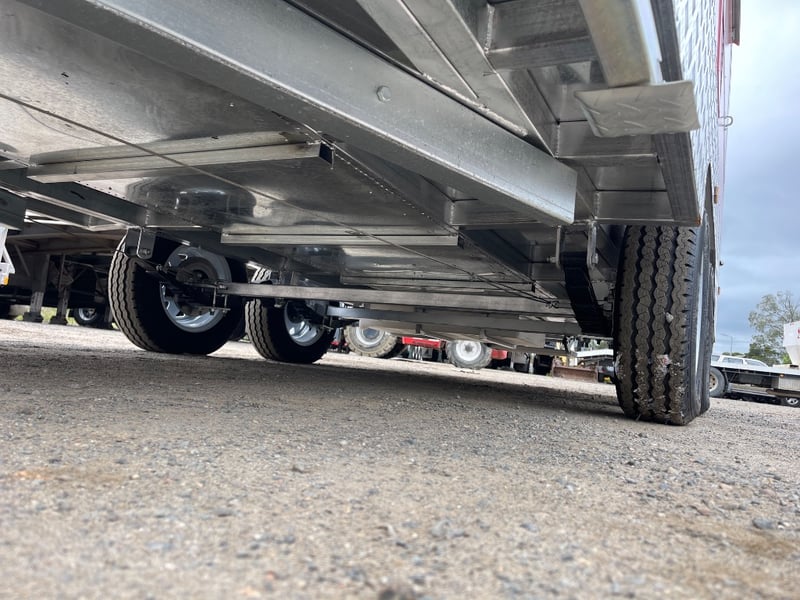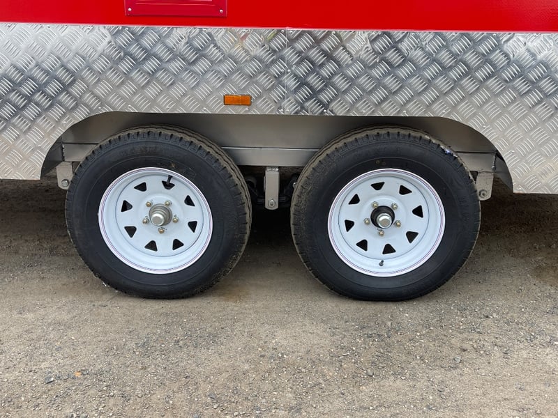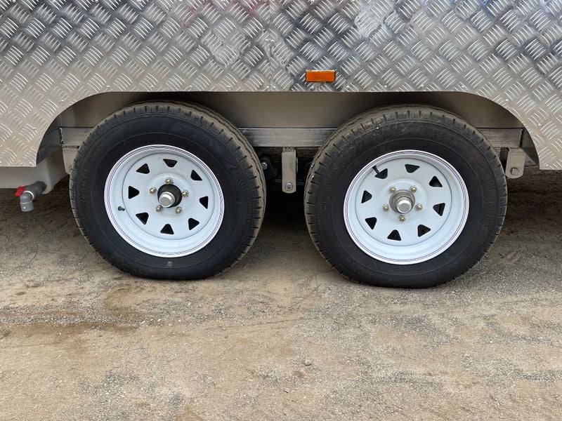 Heavy duty roller rocker suspension, Tandem axle 40x40 solid axle, Tyres 185/R14 with steel painted rims