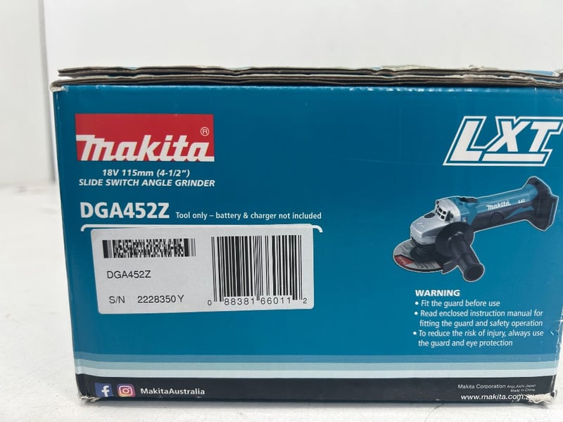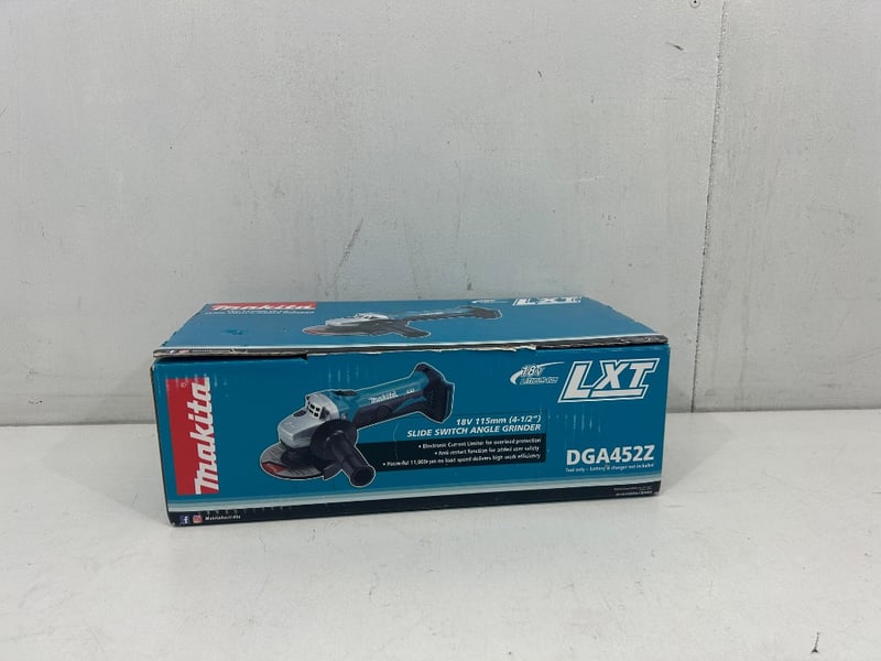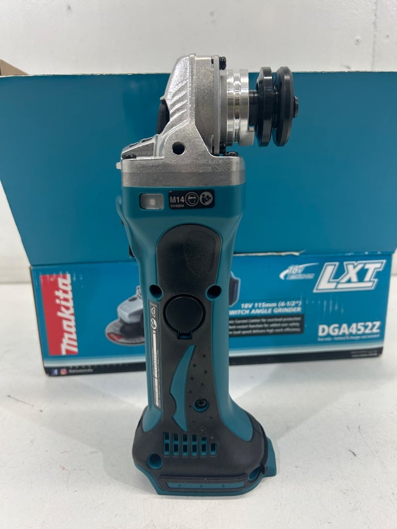 model- DGA452Z (18V LXT 115mm slide switch, Skin Only). Unit is in working condition and comes as shown with guard, side handle, disc, original box and manual.