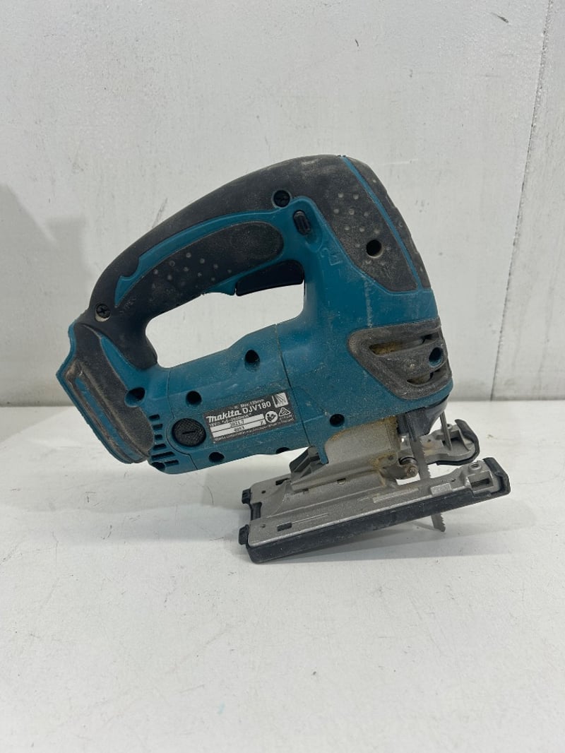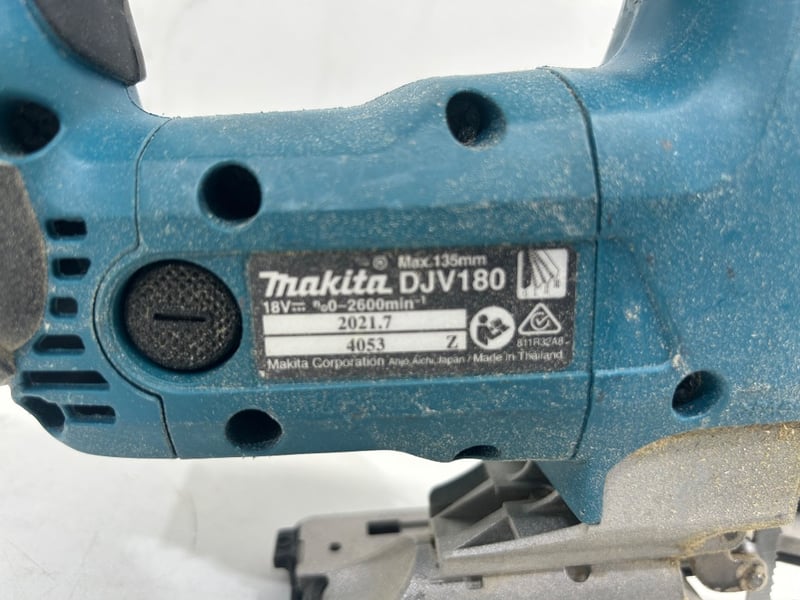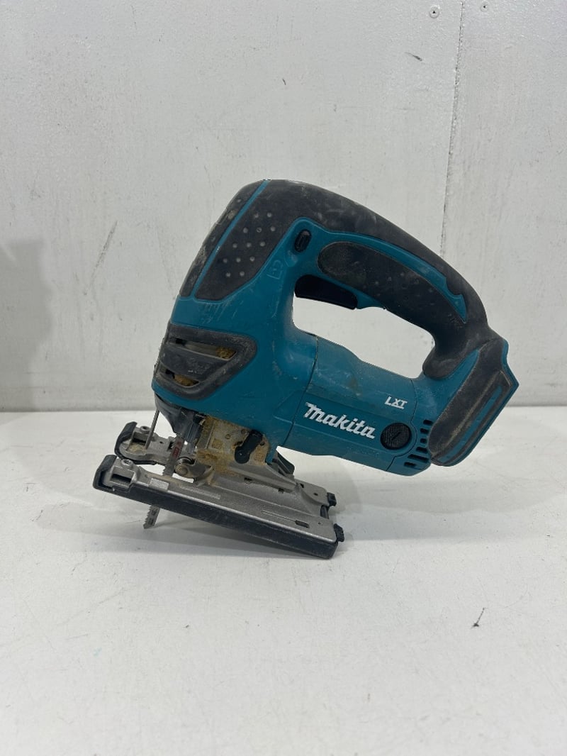 Makita 18V LXT cordless jigsaw (model DJV180) with adjustable base plate and blade installed. Tool shows general wear from use. Item is in working condition. - Skin Only