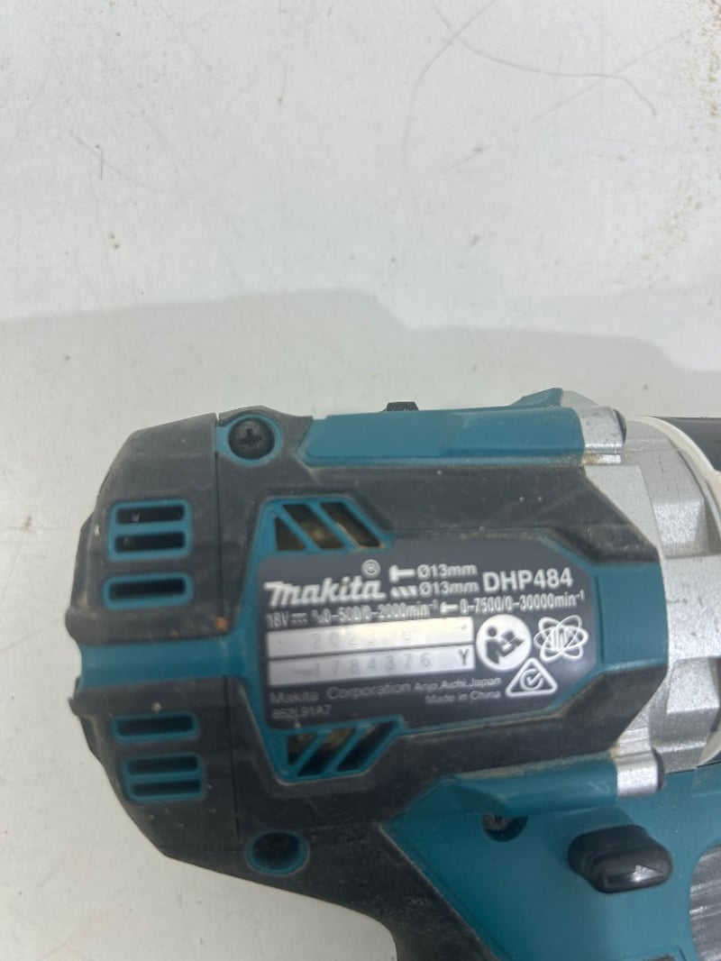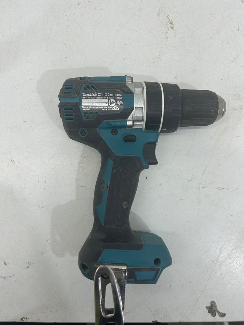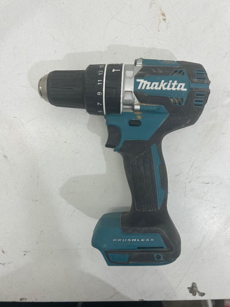 Makita 18V LXT brushless cordless hammer driver drill (model DHP484). Features a 13mm keyless chuck, variable speed trigger, forward/reverse function, and torque adjustment settings. Item is in working condition. - Skin Only