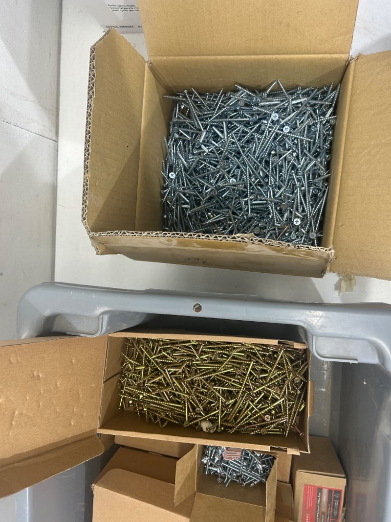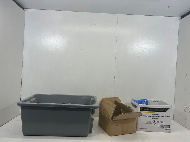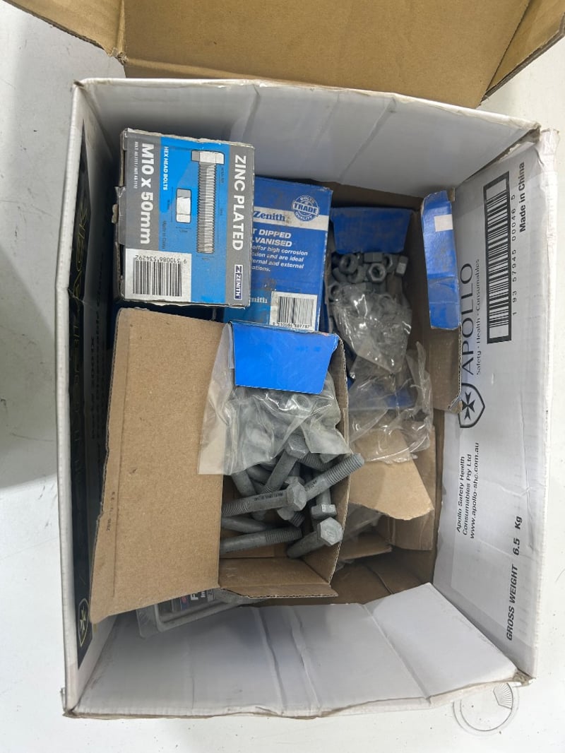 assorted lot includes, bulk lot of fasteners and hardware stored in a plastic tub. Contents include assorted zinc-plated and galvanised screws, bolts, hex bolts, nuts, and fixings in various sizes (mixed brands including Dorset and Zenith), along with an Apollo Black nitrile disposable gloves box (X-Large, 1000 pcs). Items are loose and boxed as pictured. Sold as a mixed lot.