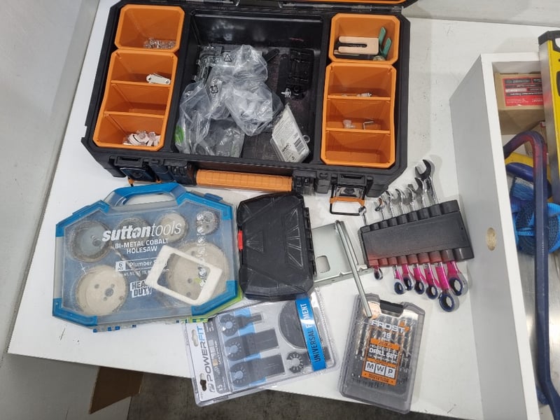 Mixed tools, Brands sutton tools, AEG, furnware, Includes drill set, blades, plumber set etc. Sold as lot.
