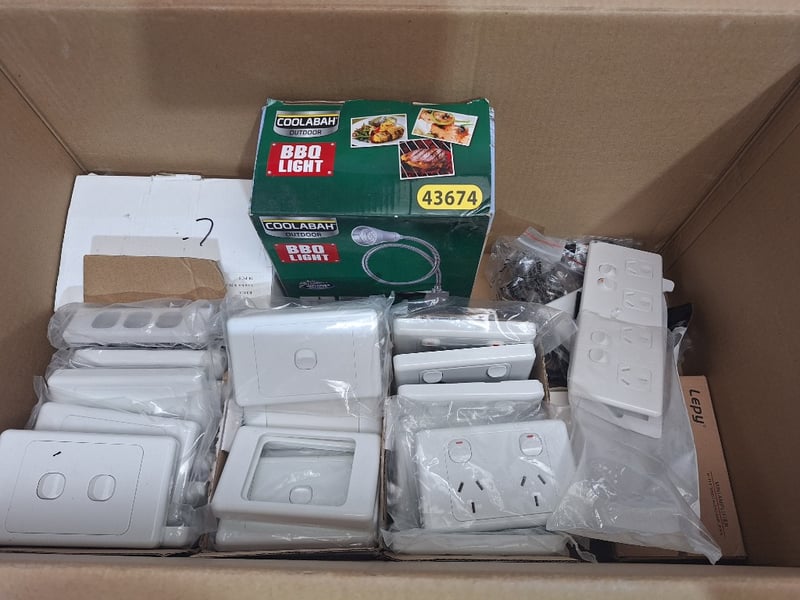 Bulk lot of household and electrical items including Coolabah BBQ Light with gas hose and fittings, multiple white electrical switches and power outletsSOLD AS LOT