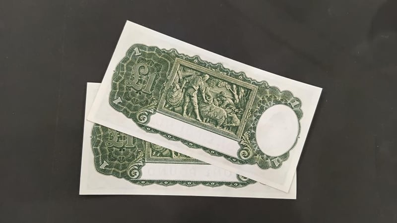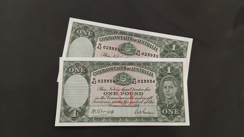 1942 2 X 1 POUND NOTES (CV$1700 R30A REN) Dk Green Appear Unc Armitage Macfarlane 488447+4