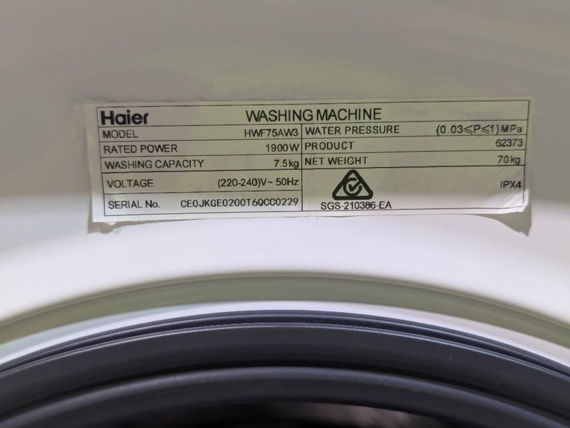 RRP:$749 Haier 7.5kg Front Load Washer, Model No: HWF75AW3, Serial: CE0JKGE0200T6QCC0229