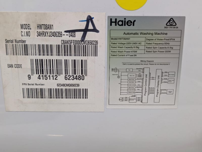 RRP: $999 Haier 8kg Top Load Washing Machine - White. Model No. HWT08AN1, Serial: CBAK5FE0000CM0650239