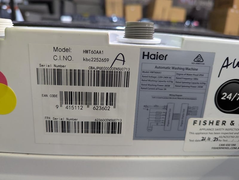 RRP $609. Haier 6kg Top Load Washing Machine, Model No. HWT60AA1, Serial: BAJPGE0000CEN5U0713