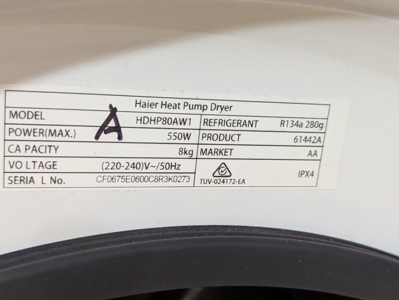 RRP: $1099, Haier 8kg 300 Series Heat Pump Dryer, Model: HDHP80AW1, S/N: CF0675E0600C8R3K0273