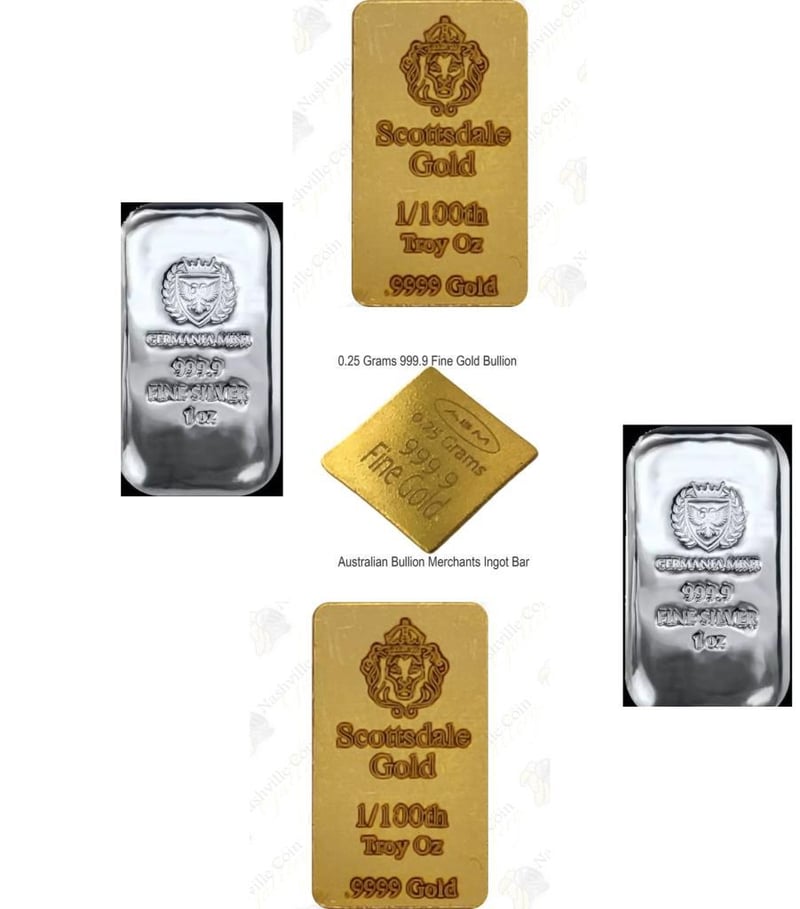 1/100 OUNCE SCOTTDALE GOLD BAR X 2, 2 X 1 OUNCE GERMANIA MINT SILVER BARS & 0.25 GRAM ADM GOLD BARS CERTIFIED
