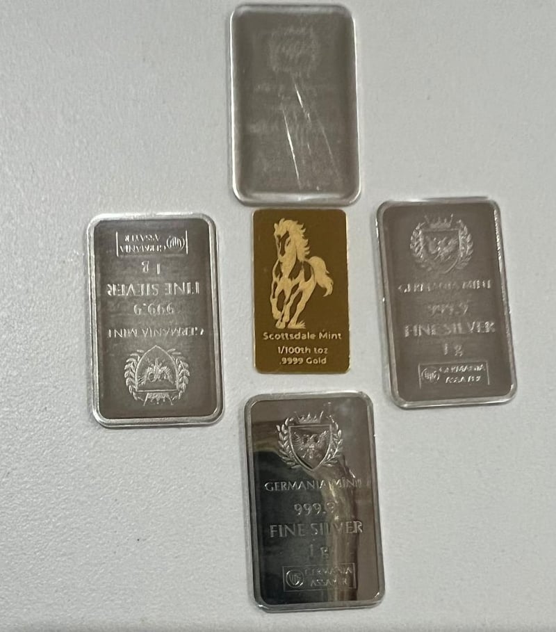 1/100 OUNCE SCOTTDALE GOLD BAR X 4 X 1 GRAM SILVER GERMANIA BARS