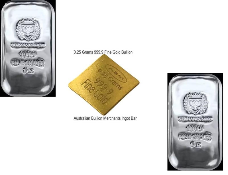 0.25 GRAM ABM GOLD BAR & 1 OUNCE GERMANIA SILVER BAR X 2