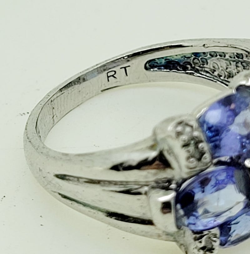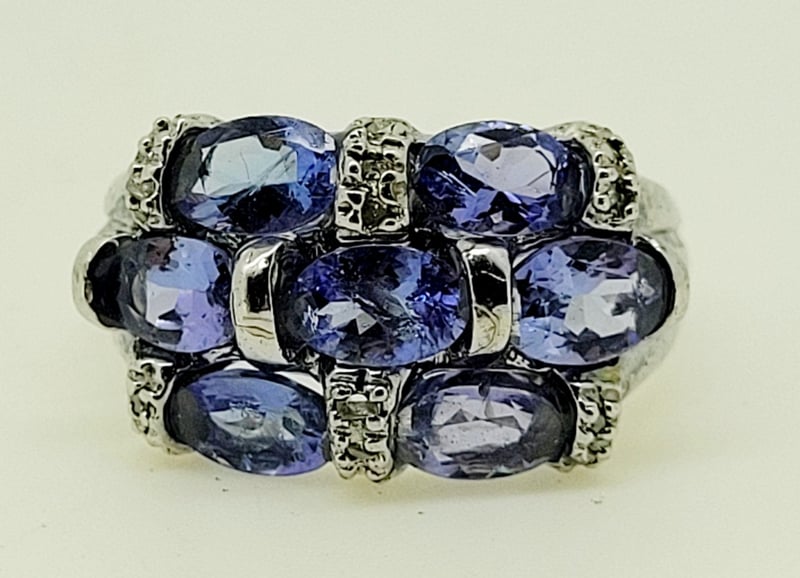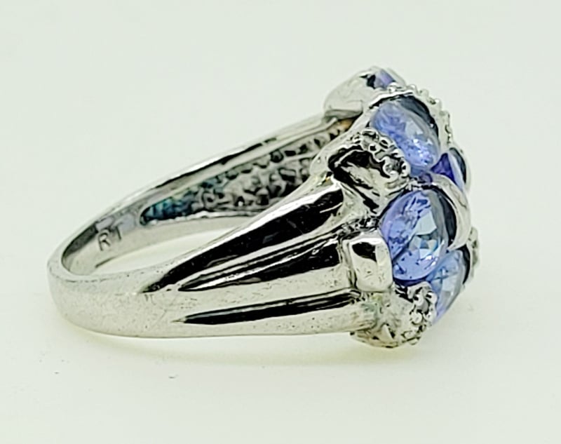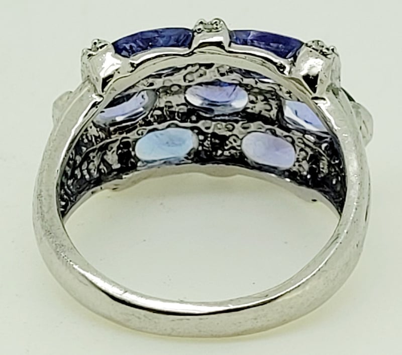 3.08CT SILVER TANZANITE AND DIAMOND RINGSet Across The Top In Three Bands With 7 Oval Cut Tanzanite Totalling Approx . 3.08 Ct And Table Cut Diamonds , Width 12Mm , Size NCondition: Good - Refer To Images488436+21
