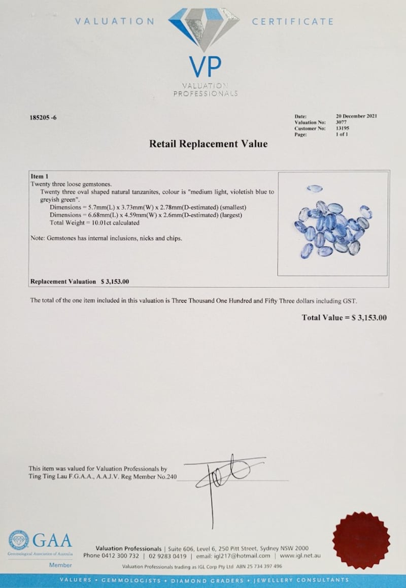 10.01CTS TCW OVAL SHAPED TANZANITE GEMSTONESCondition: Good - Refer To ImagesThis valuation has been conducted by an independent third-party professional. The valuation amount is an assessment by the issuing valuer and does not reflect the auction value of the item.Any inquiries regarding the valuation should be directed to the issuing valuer (refer to contact details on the certificate), as Lloyds Auctions has no affiliation or influence over the valuation, the valuer, or the stated amount.Insurance Replacement Valuation Amount: $3,153.00488436+4