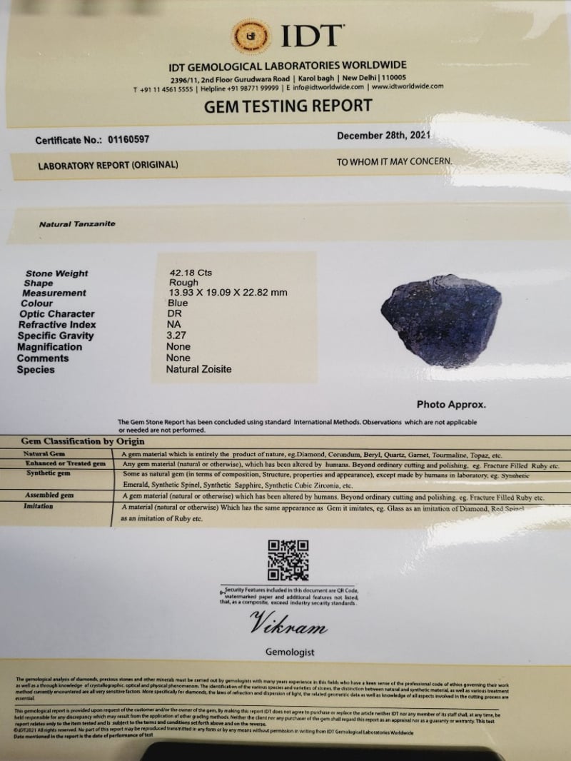 42.18CT CERTIFIED ROUGH TANZANITEProvenance: 13.93 X 19.09 X 22.82Mm Rough Gemstone , Idt Certified488436+27