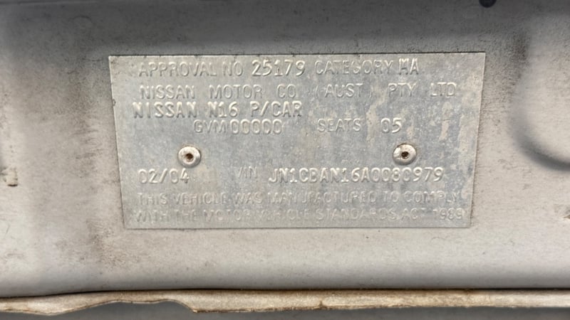 2003 Nissan Pulsar N16 ST-L Year: 2003 Make: Nissan Model: Pulsar Series: N16 Badge: ST-L Body: 4-Door Sedan Drive Type: Front wheel drive Odometer: Indicating 176,528 Kilometers Engine: 1.8 I4 Petrol Transmission: 4-Speed Automatic Colour: Silver Or Chrome Seats: 5 Description/extras: Air Conditioning, Power windows, SRS, Digital dash. Rear bumper area impact damage with cracked light cluster, scattered minor dents and scratches to door panels, bonnet surface marking, interior trim wear consistent with age and mileage, floor mat deterioration. Inspection recommended. VIN: JN1CBAN16A0080979 ENG No: QG18350610A (Key #B50 carrara) Lloyds stock #583250+1 #PCV