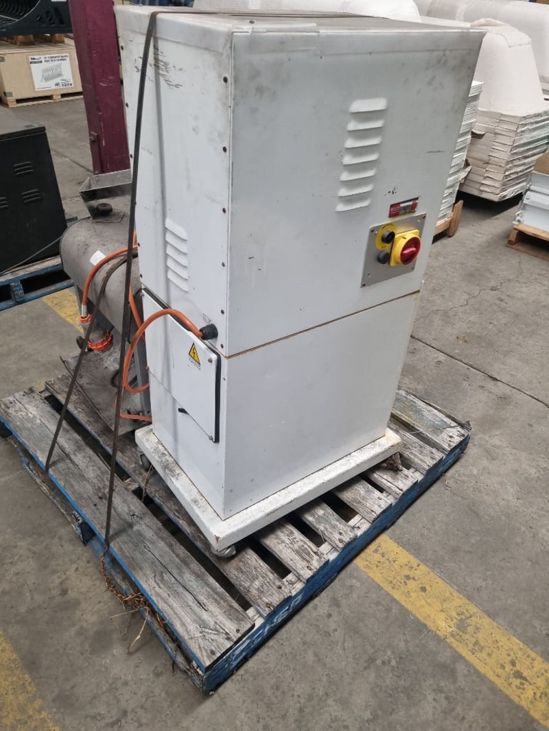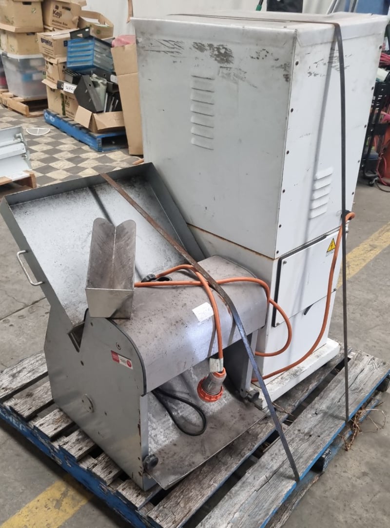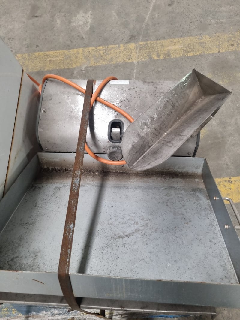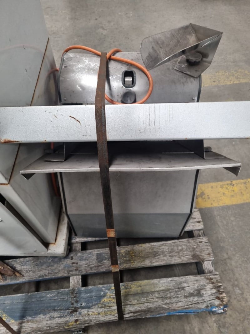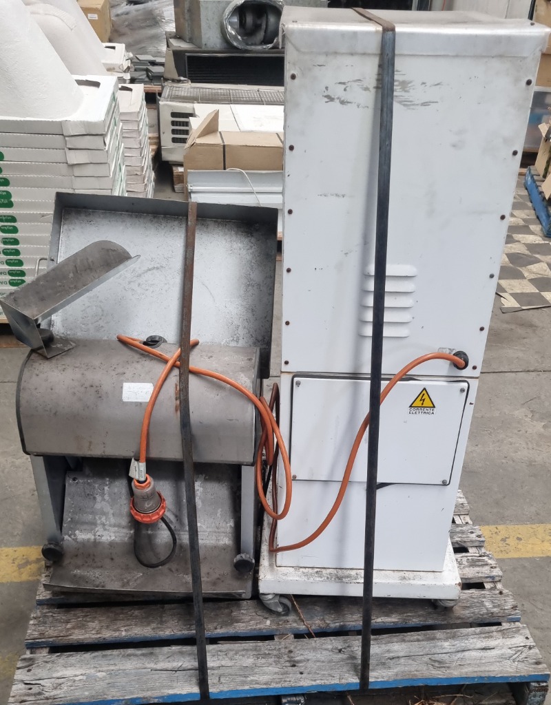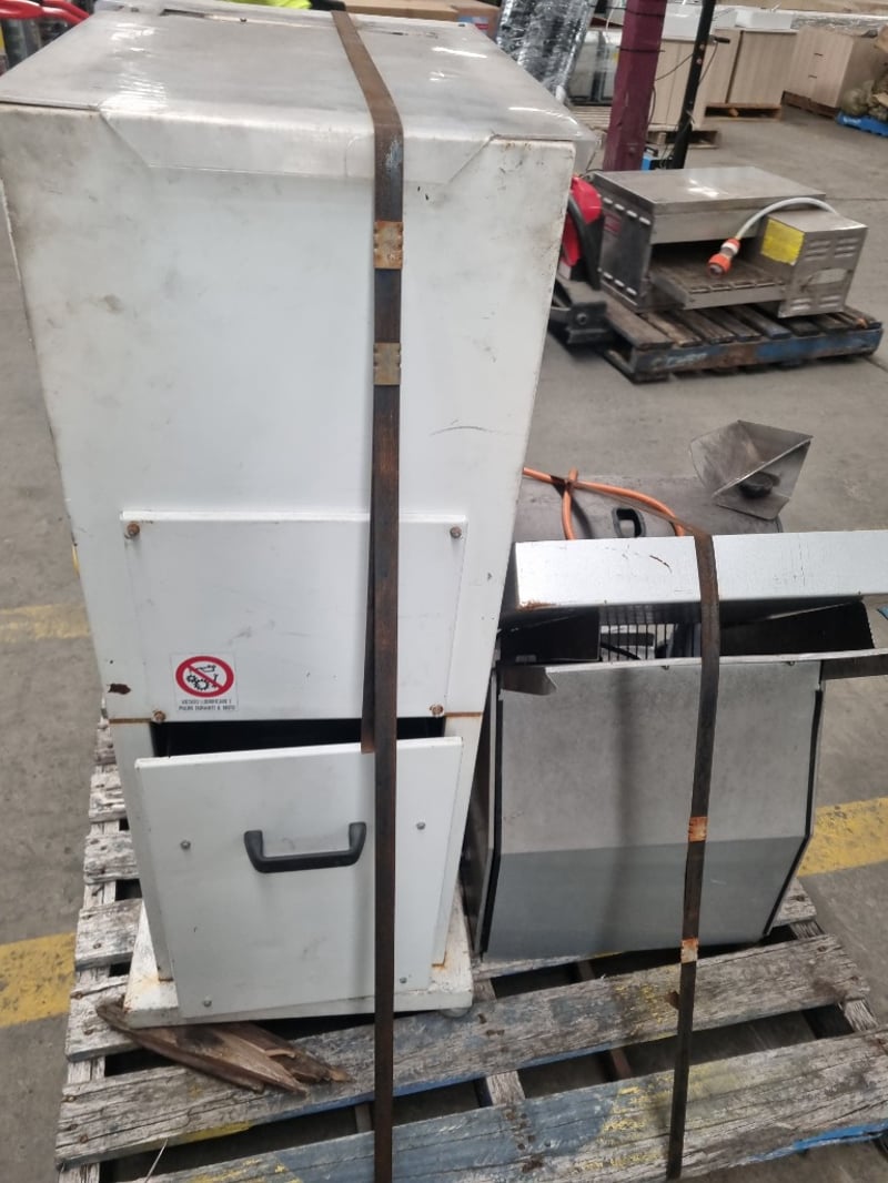 Commercial catering equipment bundle comprising a stainless steel prep table with integrated sink and drainboard, a heavy-duty commercial fryer with metal construction and orange power cord, and a white insulated holding/warming cabinet with emergency stop controls and yellow/red safety button panel. The fryer features a metal drum-style heating chamber with removable basket assembly. The prep station includes a spacious work surface with integrated waste collection tray.Note : signs of wear, untested