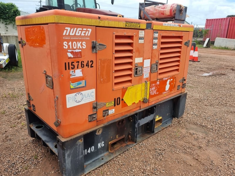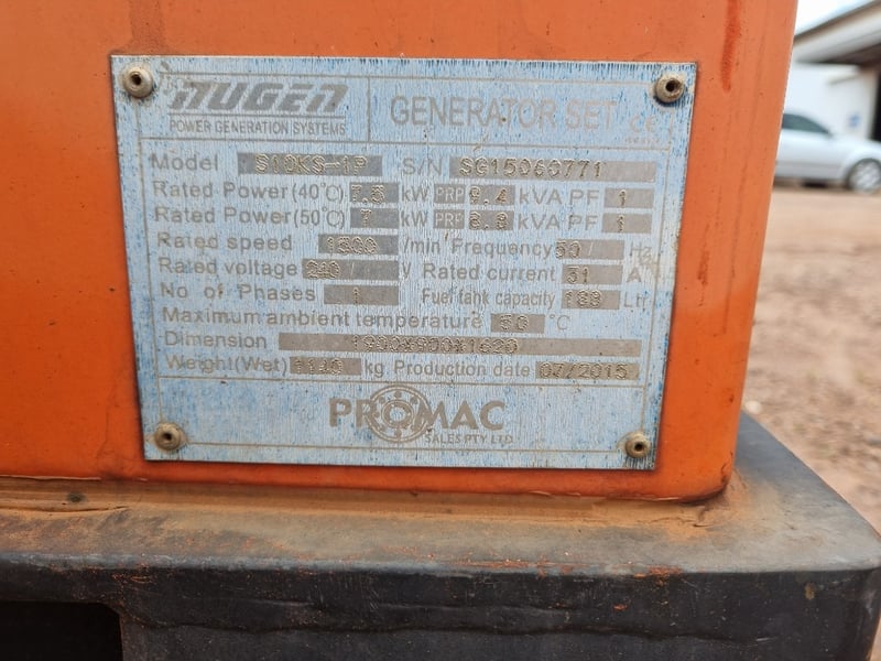 Promac Nugen 10kva Diesel Generator Year: 2015 Make: Promac Nugen Model: S10KS-19 Serial No.: SG15060771 Fuel Tank Capacity: 188 Litres Notes: Unconfirmed is operational - Exhaust manifold has damage ( refer to photos ) Ref: 1157642 Notes: Said to be in working order Contact: Mark David - 0437 318 344 Lloyds Stock# 153921+6 #Plant&Equipment