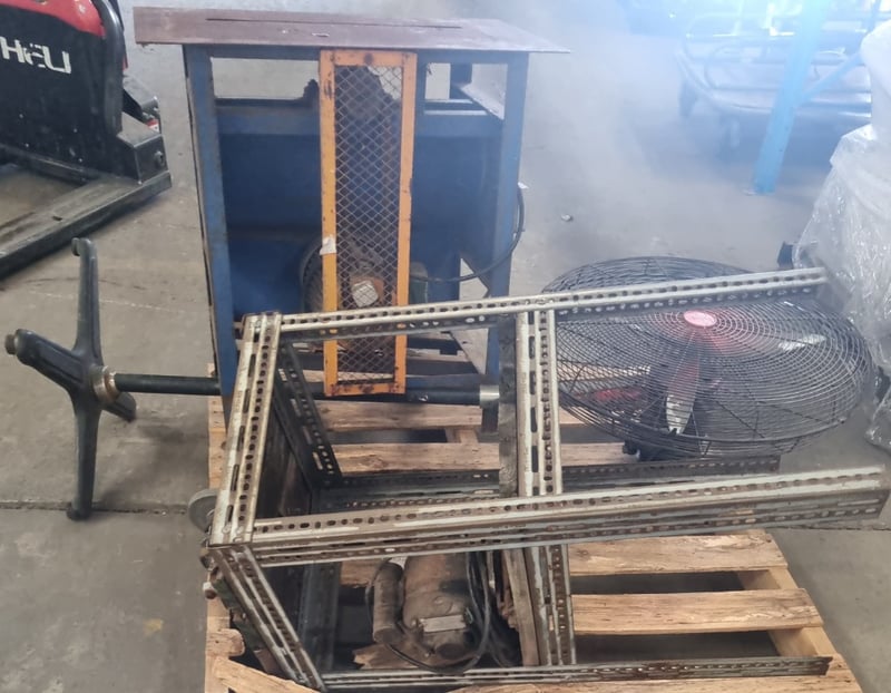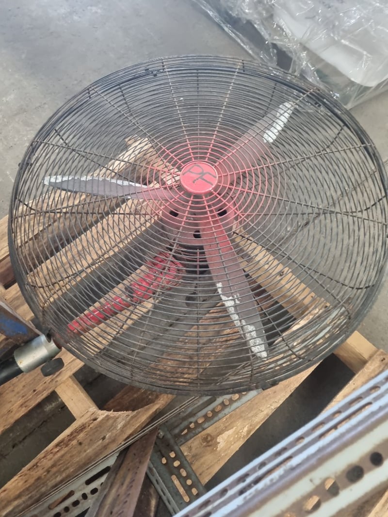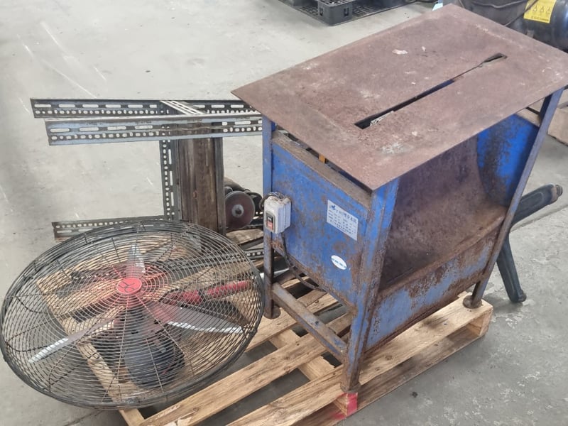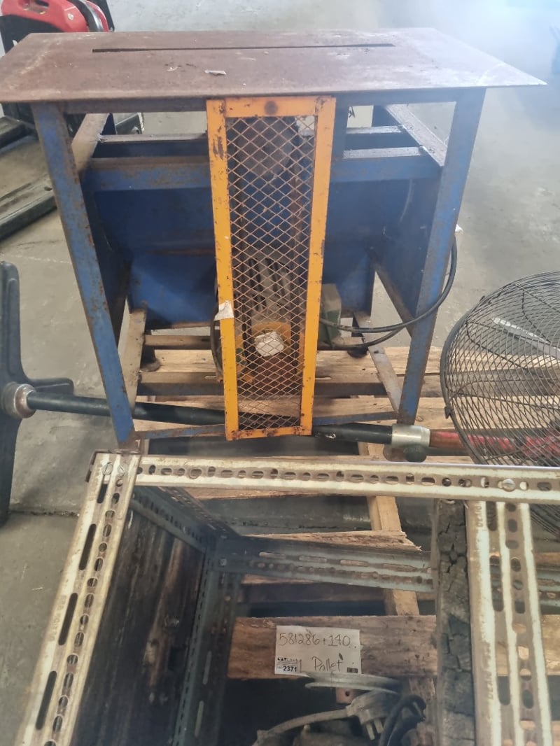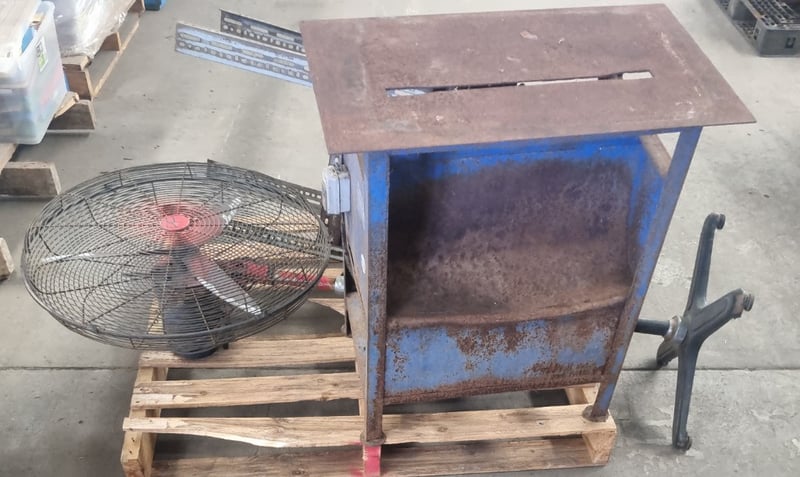 Industrial portable cooling system featuring a large diameter floor-standing fan with protective wire mesh guard and red hub. The assembly includes a blue metal enclosure box mounted on a wooden pallet base with steel angle iron framework. The unit comprises a heavy-duty electric motor with visible cooling fins, interconnected via metal strut and channel construction. A metal work surface tops the enclosure, featuring a slot cutout for access. The system includes adjustable leg supports and mechanical components typical of mid-20th century industrial workshop equipment. Shows significant rust patina and weathering consistent with outdoor storage. Complete with integrated metal framework for structural support and mobility.
