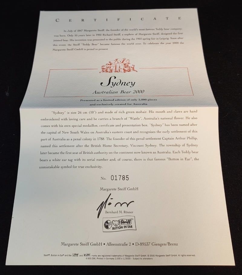 LIMITED EDITION 2000 MADE, STEIFF COLLECTOR'S SYDNEY AUSTRALIAN 2000 BEAR