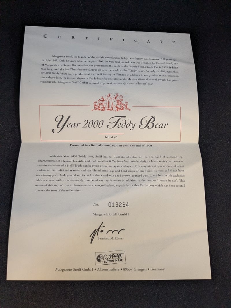 LIMITED EDITION STEIFF YEAR 2000 TEDDY BEARItem Size: Height: 35cm, Width: 24cm, Depth: 13cmColour: BlondeCondition: Good - Refer To ImagesACACIA RIDGE585023+6