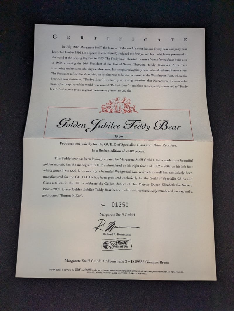 LIMITED EDITION STEIFF GOLDEN JUBILEE TEDDY BEAREdition: 1350/2002Condition: Good - Refer To Images585023+7