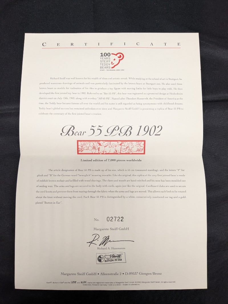 LIMITED EDITION STUFF BEAR 55 PB 1902Item Size: Height: 55cm, Width: 34cm, Depth: 34cmEdition: 2722/7000Includes Certificate Of AuthenticityCondition: Good - Refer To Images585053+3