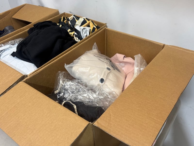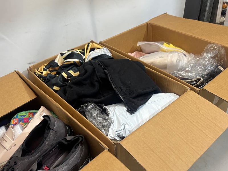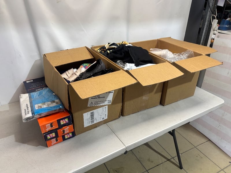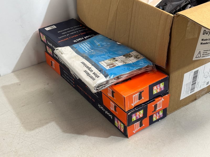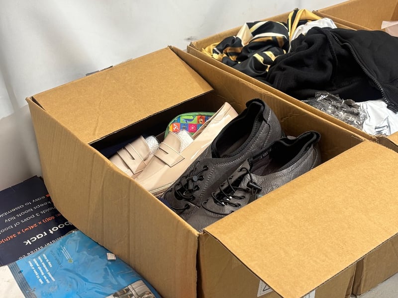 Lot of Clothing and Accessories; Including, Shoes, Jackets, Shirts, Pants, Over door Shoe Organiser, Boot Racks, Various sizes and styles