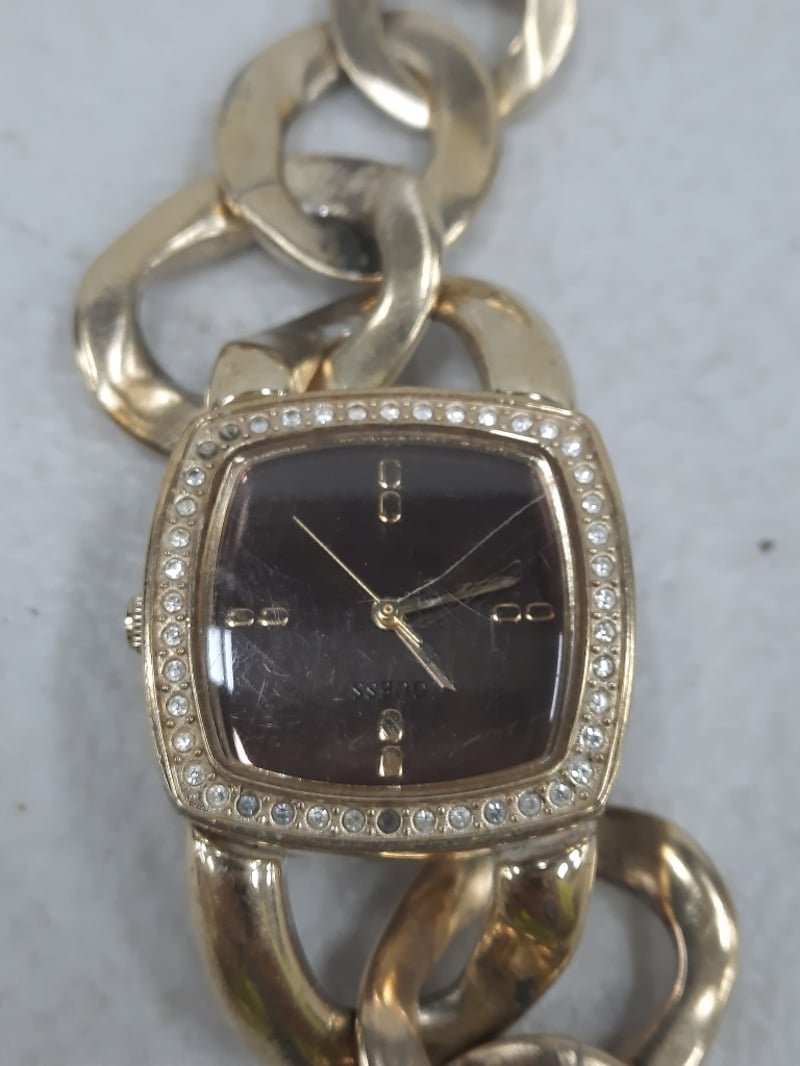 Gold coloured square watch with white stones